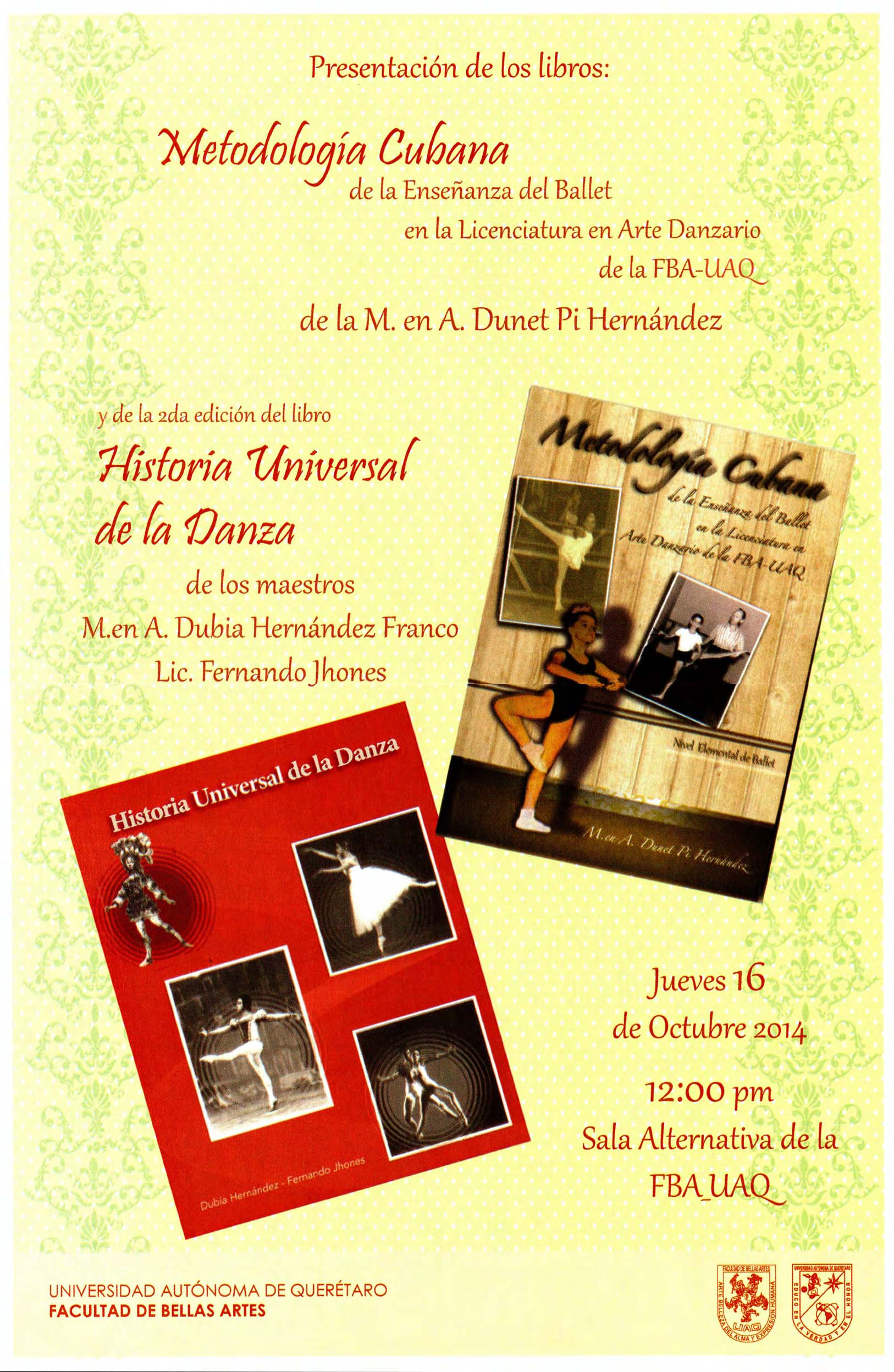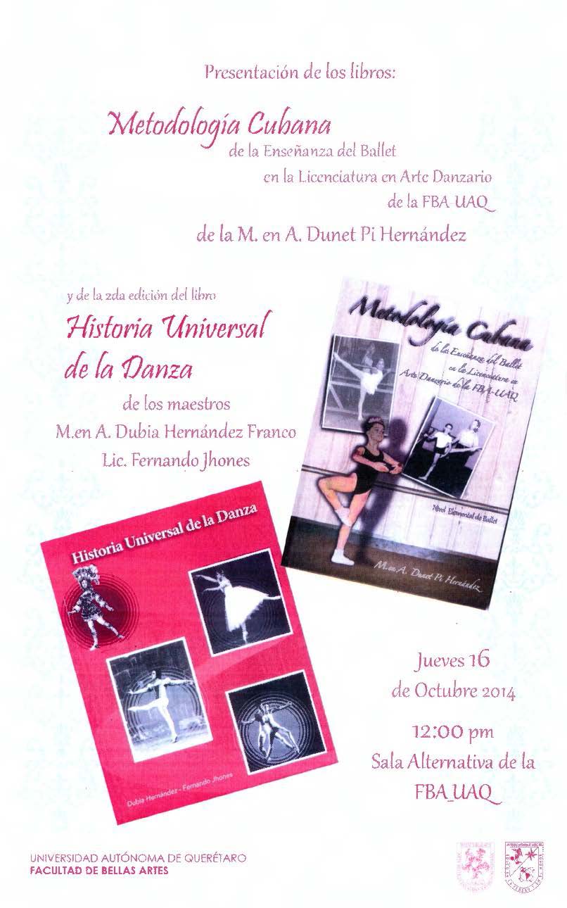 Cartel y volante para la presentación de los libros "Metodología Cubana de la Enseñanza del Ballet en la Licenciatura de Arte Danzario de la FBA-UAQ" (Dunet Pi Hernández) e "Historia Universal de la Danza. 2da Edición" (Dubia Hernández, Fernando Jhones).