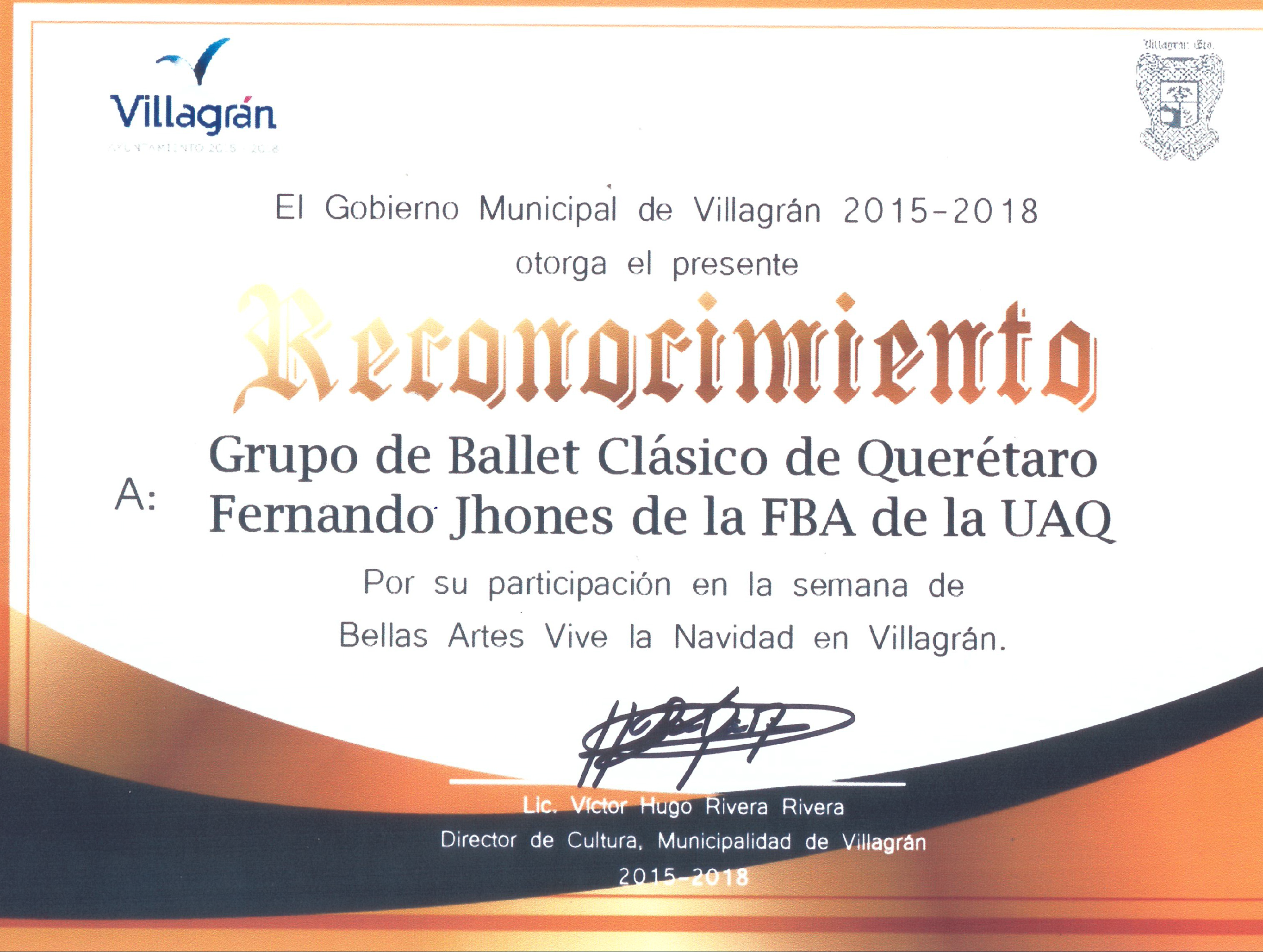Reconocimiento otorgado al Ballet Clasico de Queretaro Fernando Jhones por su participacion en la semana de Bellas Artes Vive la Navidad en Villagran