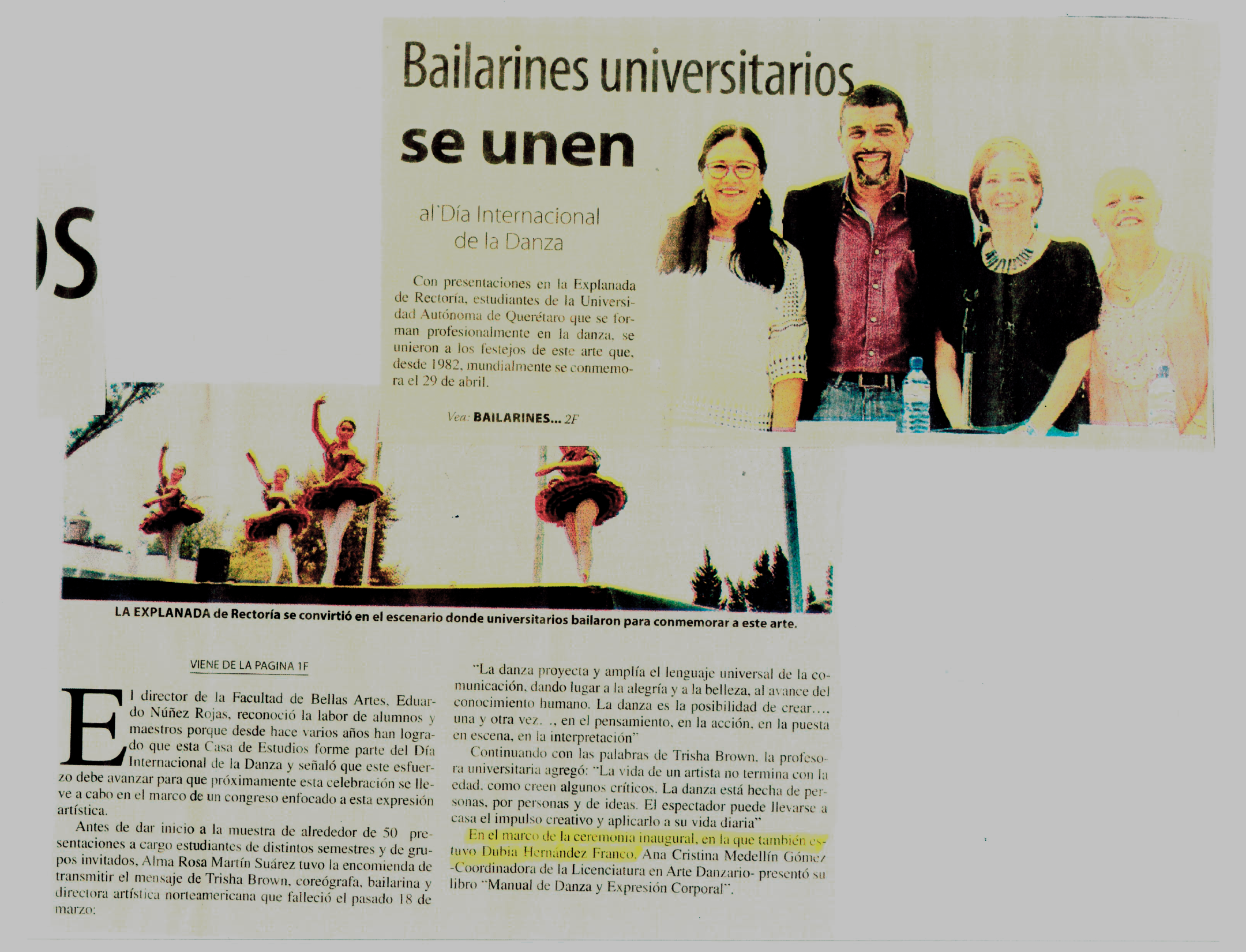 Recorte de un periodico donde se presento el titular Bailarines universitarios se unen