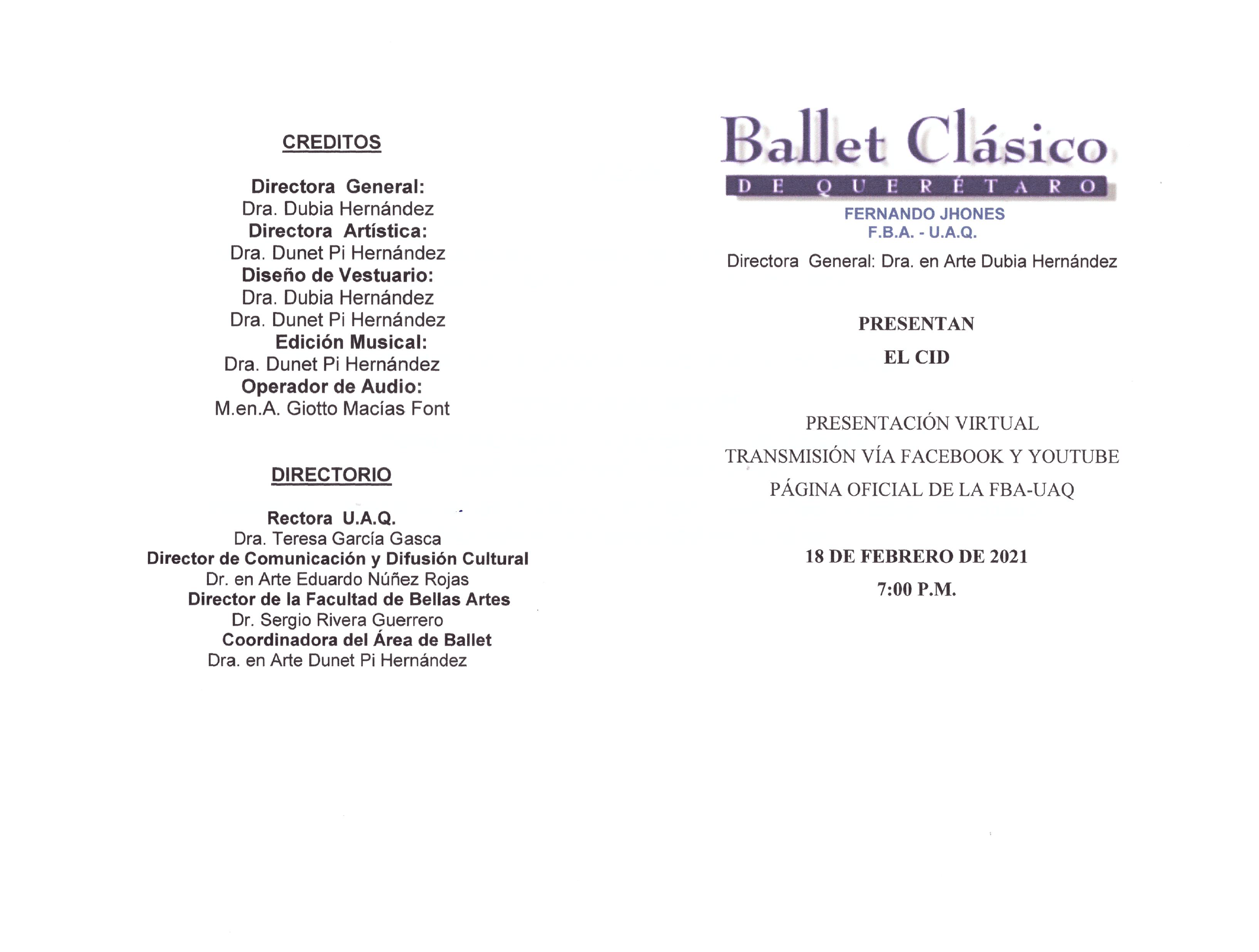 Ballet Clasico Queretaro, “Programa El Cid,” ReDCA-Ballet, consulta 9 de marzo de 2026, http://redca.uaq.mx/ballet/items/show/1017.