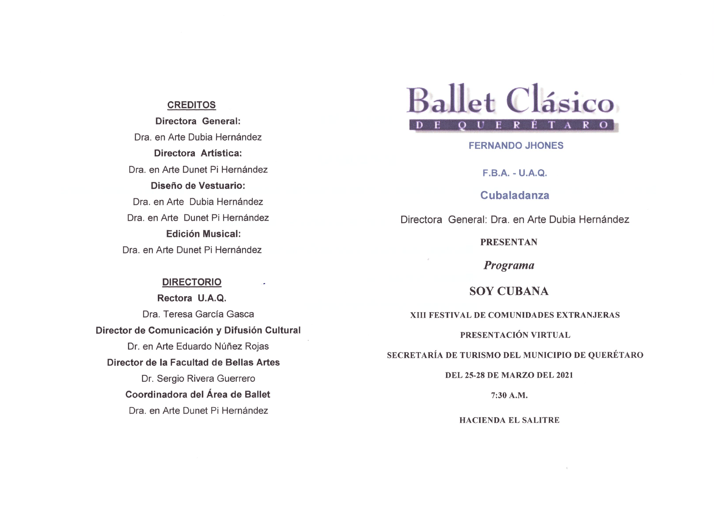 Ballet Clasico Queretaro, “Programa Soy Cubana,” ReDCA-Ballet, consulta 9 de marzo de 2026, http://redca.uaq.mx/ballet/items/show/1018.