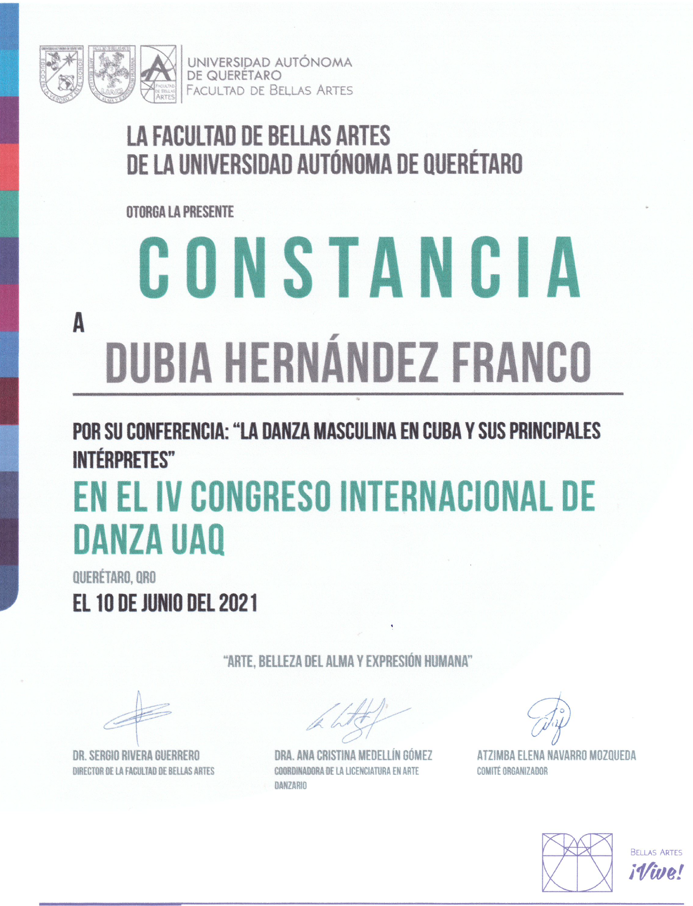 Dubia Hernandez, “Constancia IV Congreso Internacional de Danza UAQ,” ReDCA-Ballet, consulta 9 de marzo de 2026, http://redca.uaq.mx/ballet/items/show/1020.