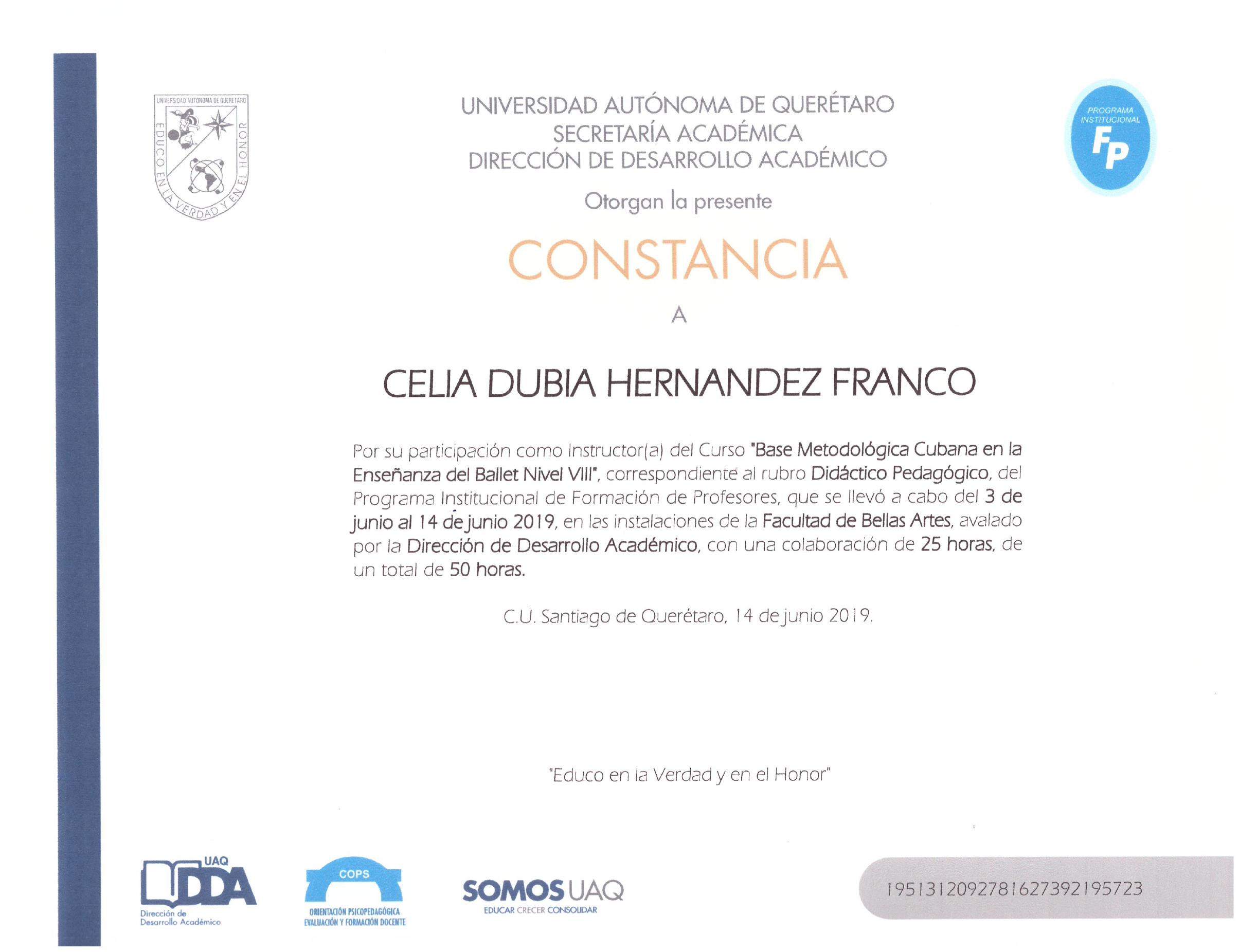 Dubia Hernandez, “Constancia curso Base Metodologica Cubana en la Ensañanza del Ballet Nivel VIII,” ReDCA-Ballet, consulta 9 de marzo de 2026, http://redca.uaq.mx/ballet/items/show/1023.