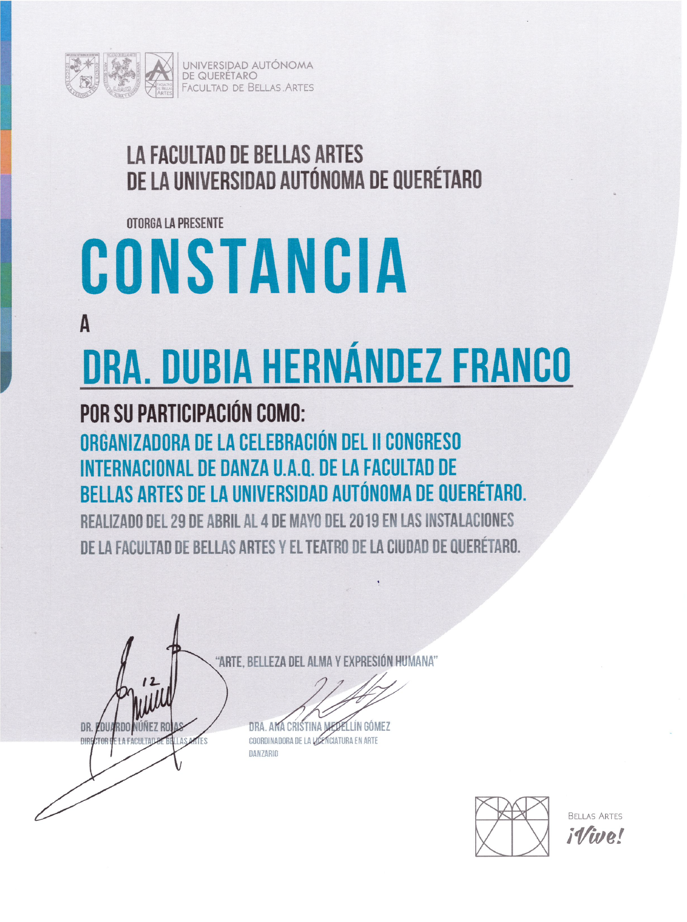 Constancia a Dubia Hernandez por su participacion como organizacion de la celebracion de II Congreso Internacional de Danza U.A.Q. de la facultad de Bellas Artes de la Universdad Autonoma de Queretaro