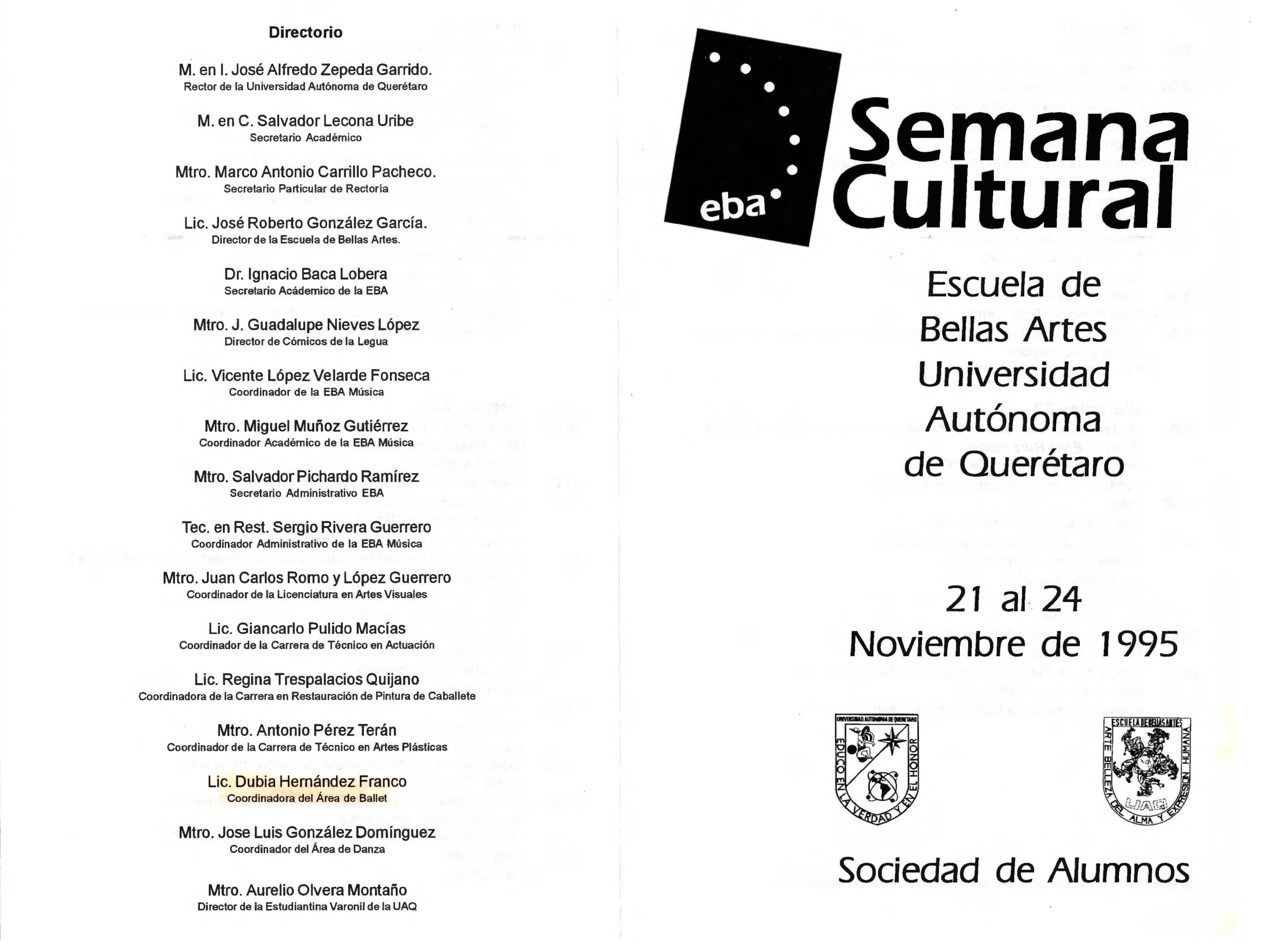Programa de eventos para la semana cultural de la escuela de Bellas Artes de la Universidad Autonóma de Querétaro.