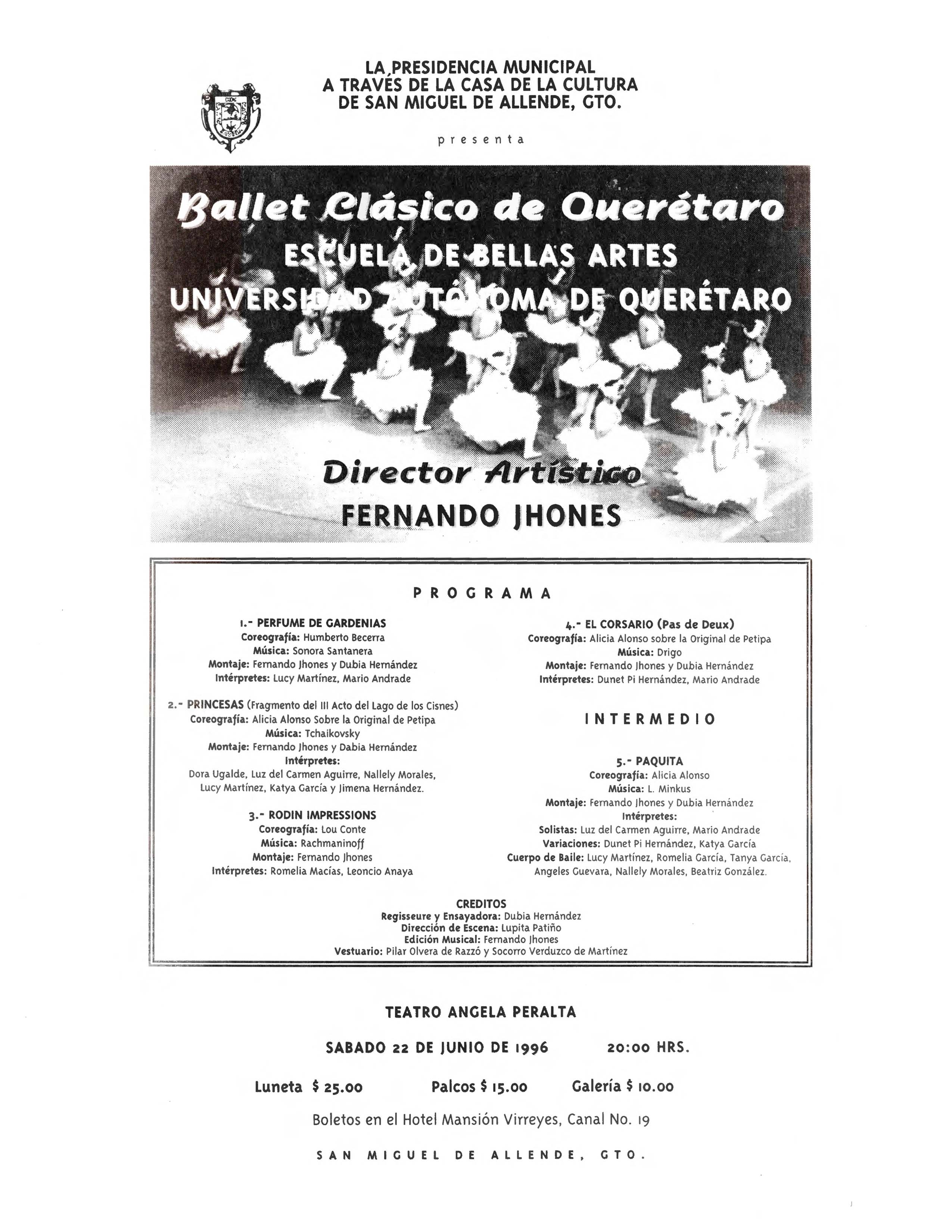 Ballet Clásico de Querétaro Fernando Jhones, “Ballet Clásico de Querétaro: Función en el Teatro Angela Peralta (Junio 1996),” ReDCA-Ballet, consulta 9 de marzo de 2026, http://redca.uaq.mx/ballet/items/show/138.