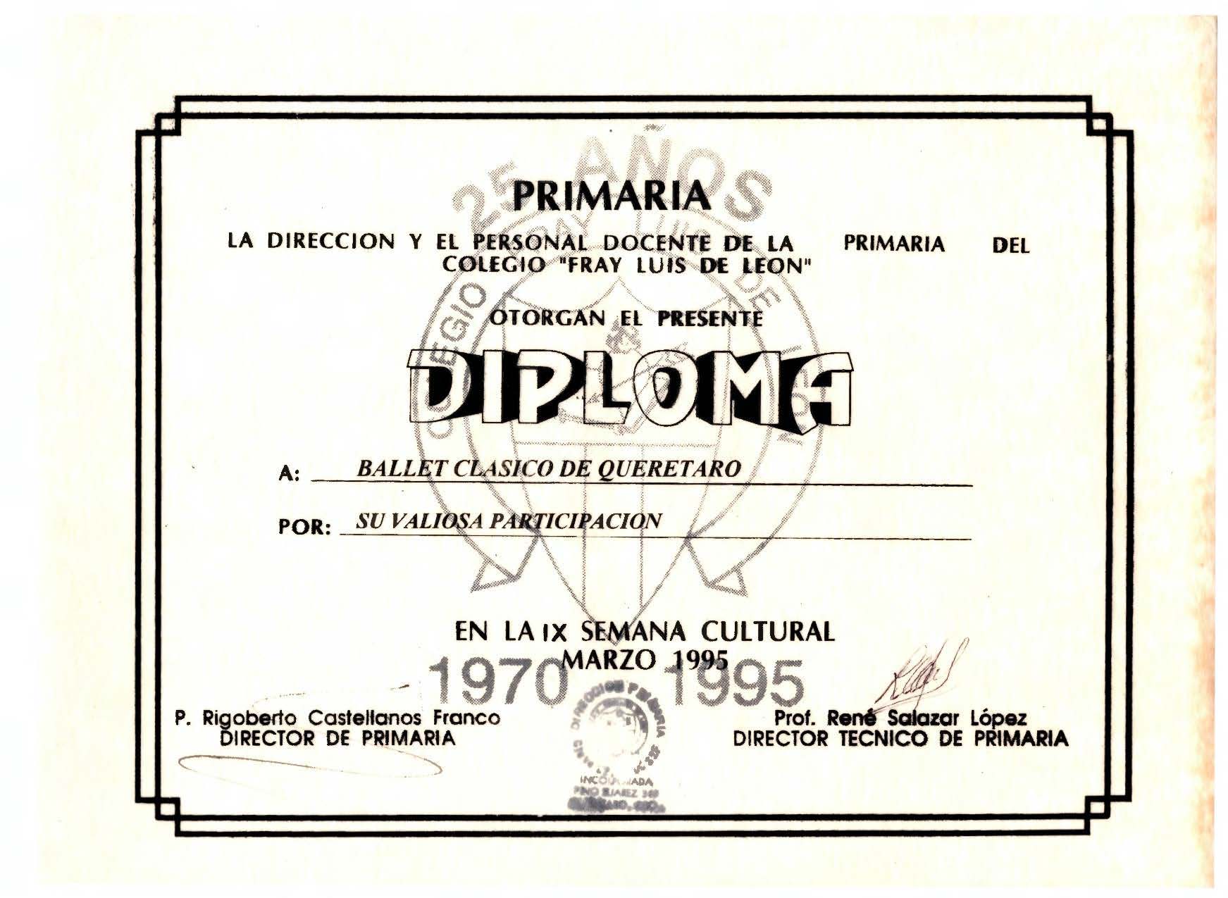 Diploma para el Ballet Clásico de Querétaro por su participación la IX semana cultural del Colegio Fray Luis de León.