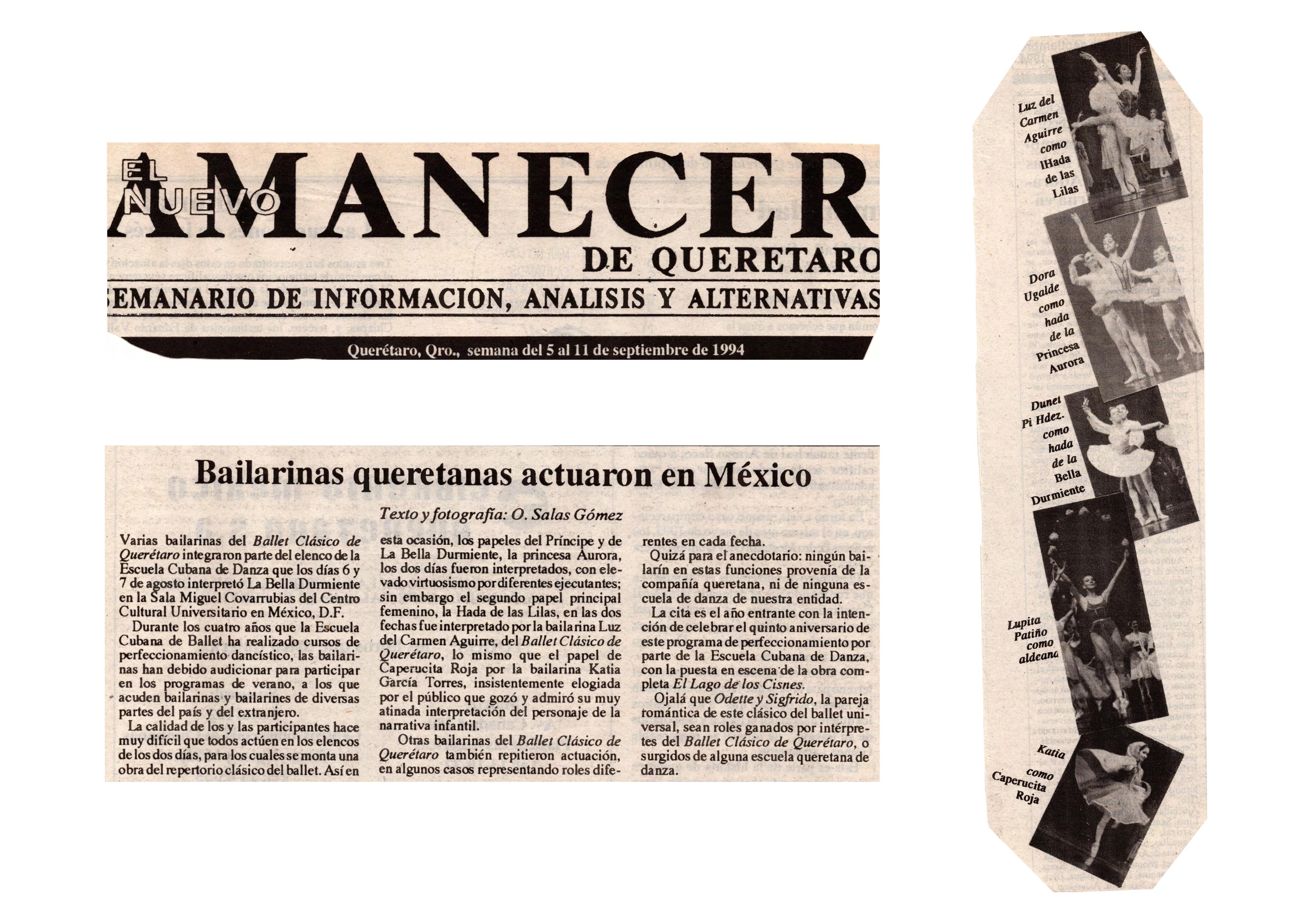 El Nuevo Amanecer de Querétaro. Querétaro, México, del 5 al 11 de Septiembre de 1994. O. Salas Gómez. Bailarinas queretanas actuaron en México.