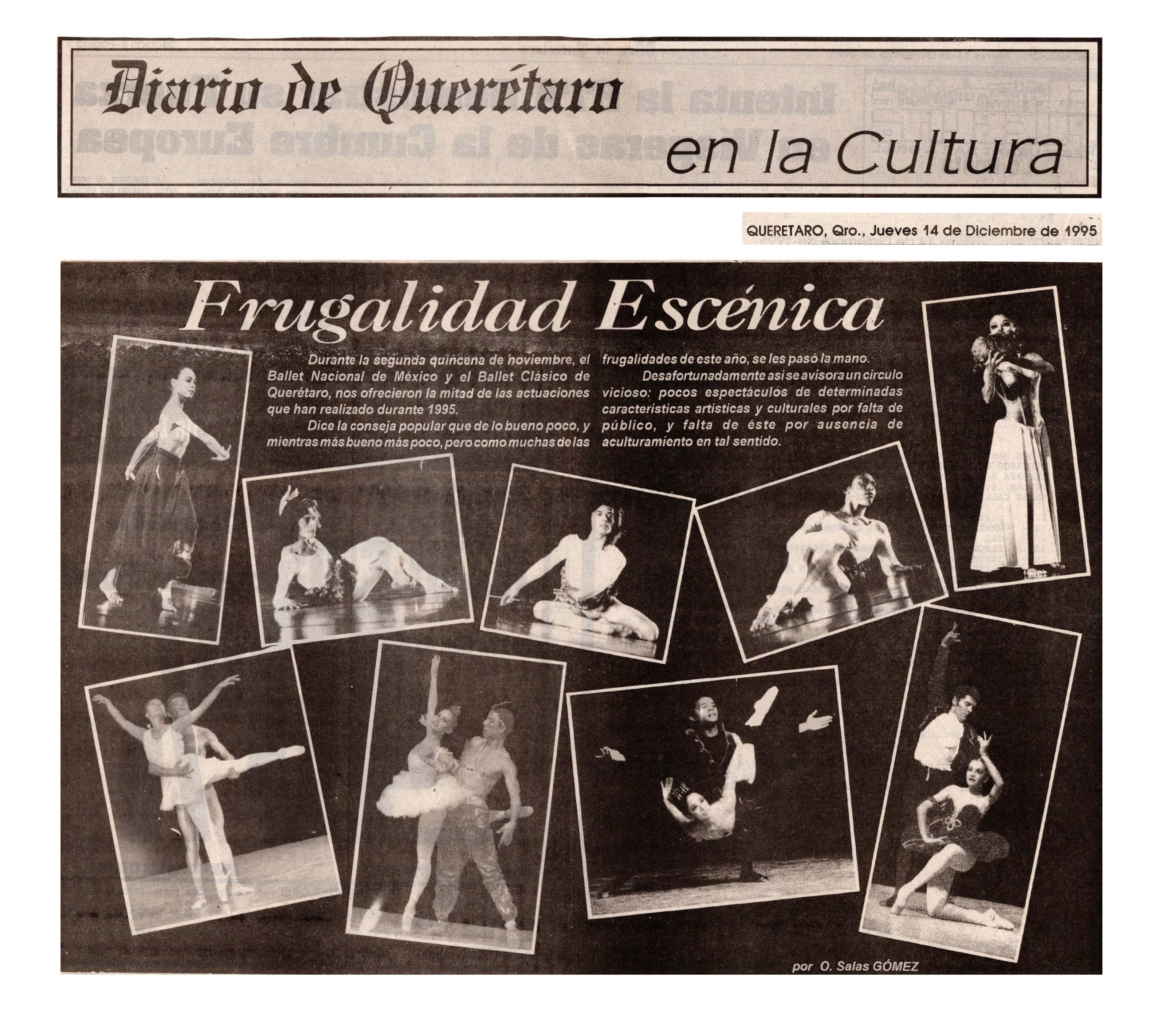 Diario de Querétaro. Querétaro, Qro. 14 de Diciembre de 1995. O. Sala Gómez. Frugalidad escénica.