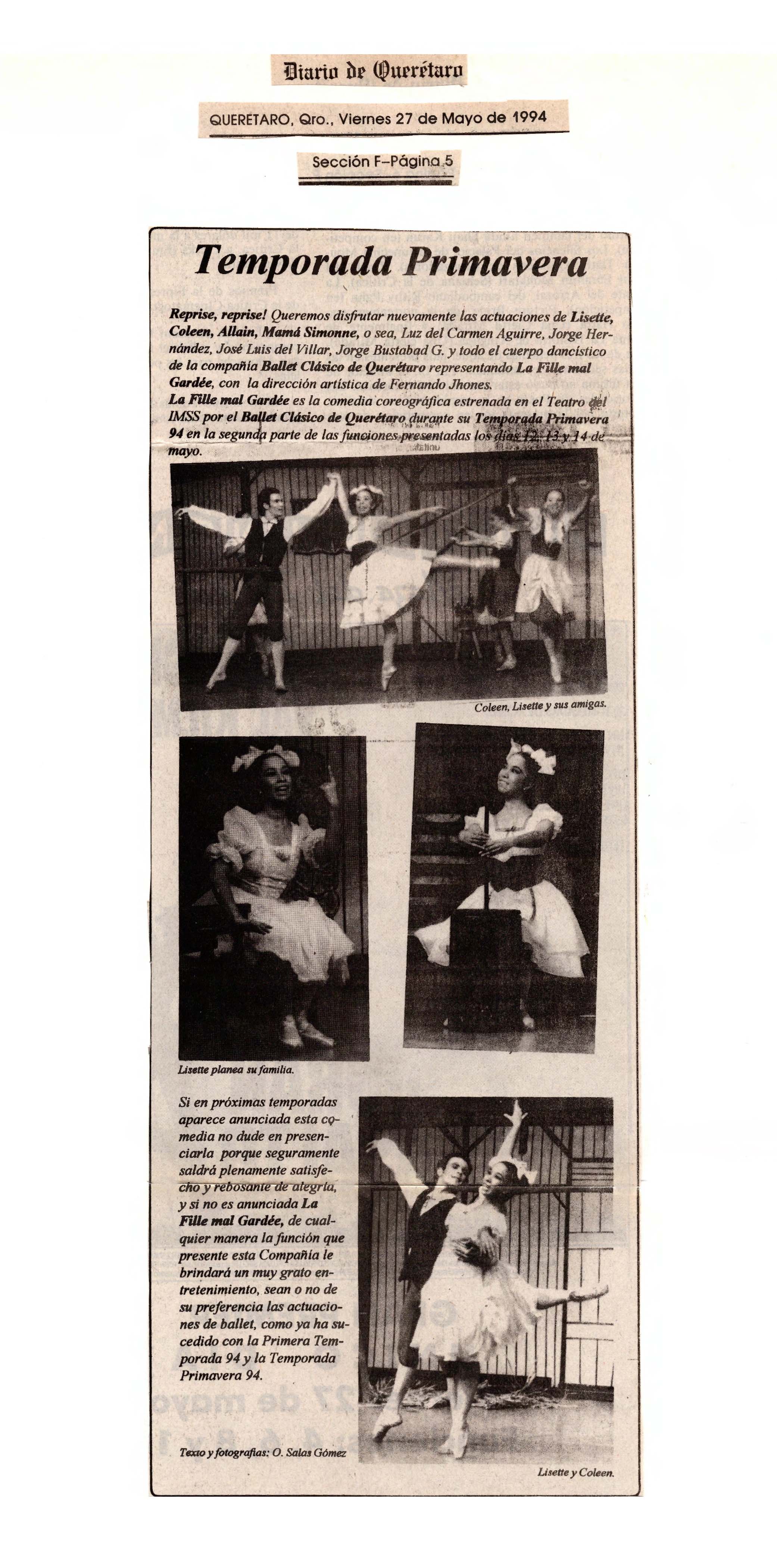 Nota en el periódico Diario de Querétaro, sobre la presentación de "La Fille mal Gardeé", protagonizada por el Ballet Clásico de Querétaro, en durante su "Temporada de primavera '94".