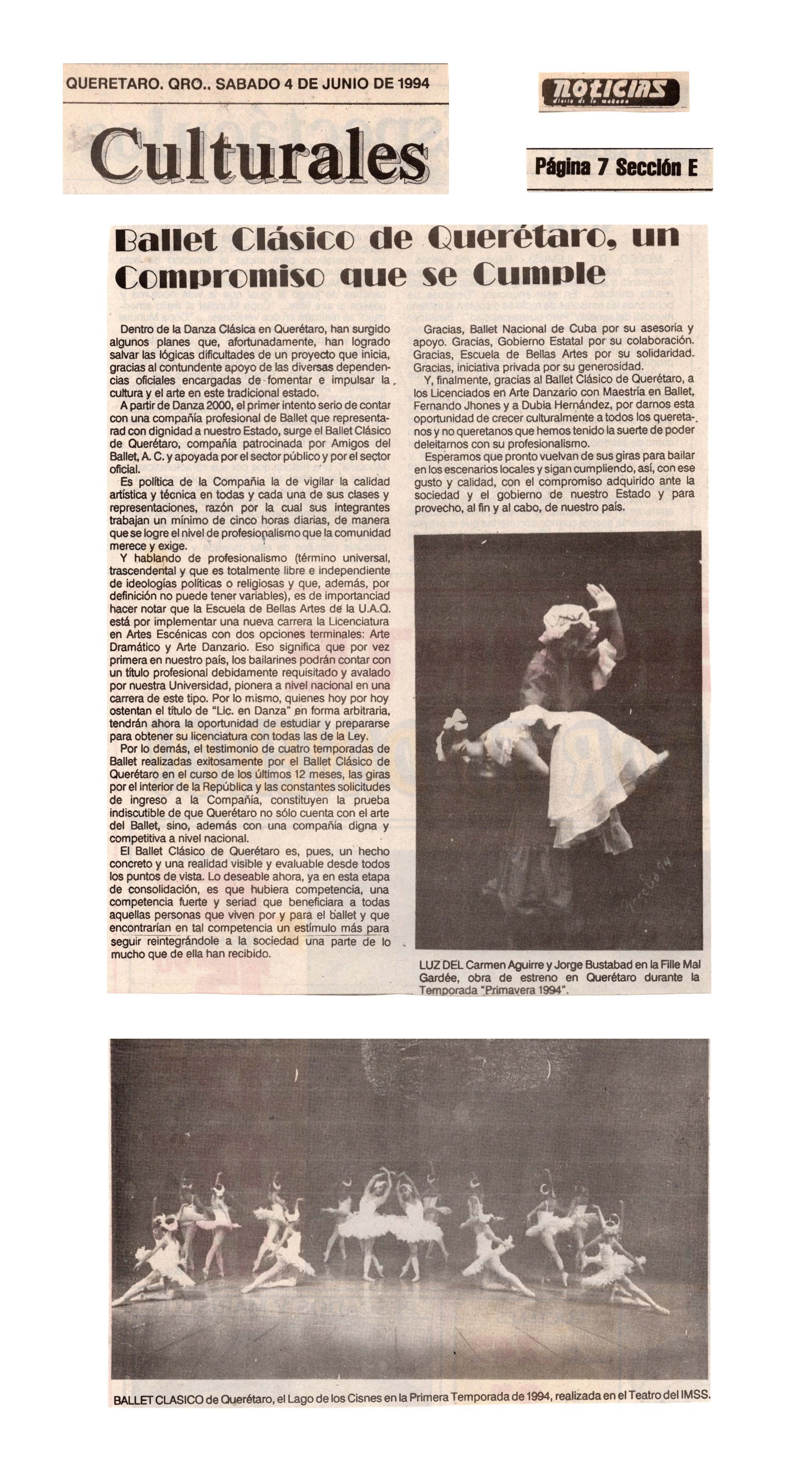 Noticias, diario de la mañana. Querétaro, Qro.4 de Junio de 1994. "Ballet Clásico de Querétaro, compromiso que se cumple". Página 7-Sección E.