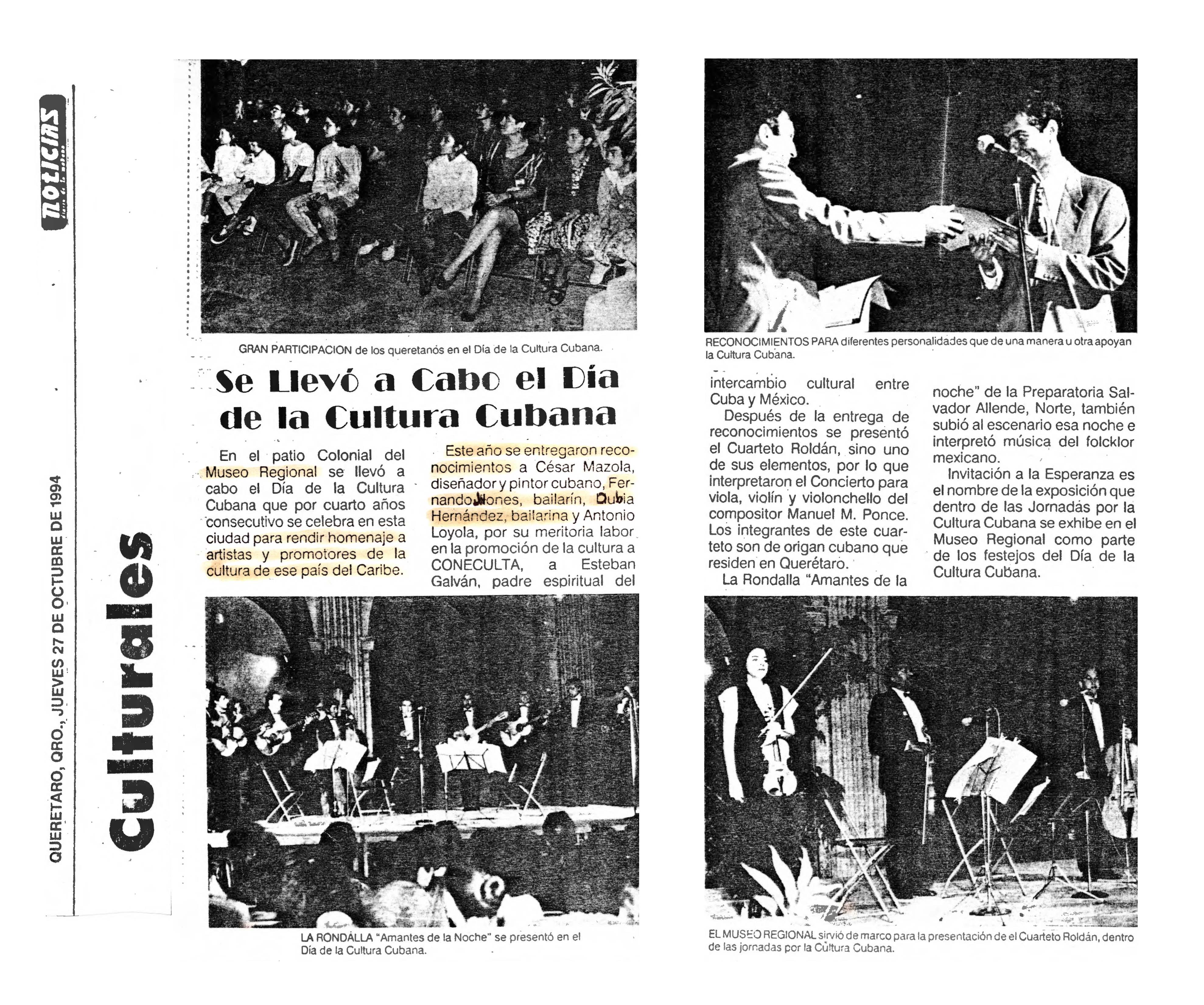 Noticias, diario de la mañana. Querétaro, Qro. 27 de Octubre de 1994. "Se llevó a cabo el día de la cultura cubana".