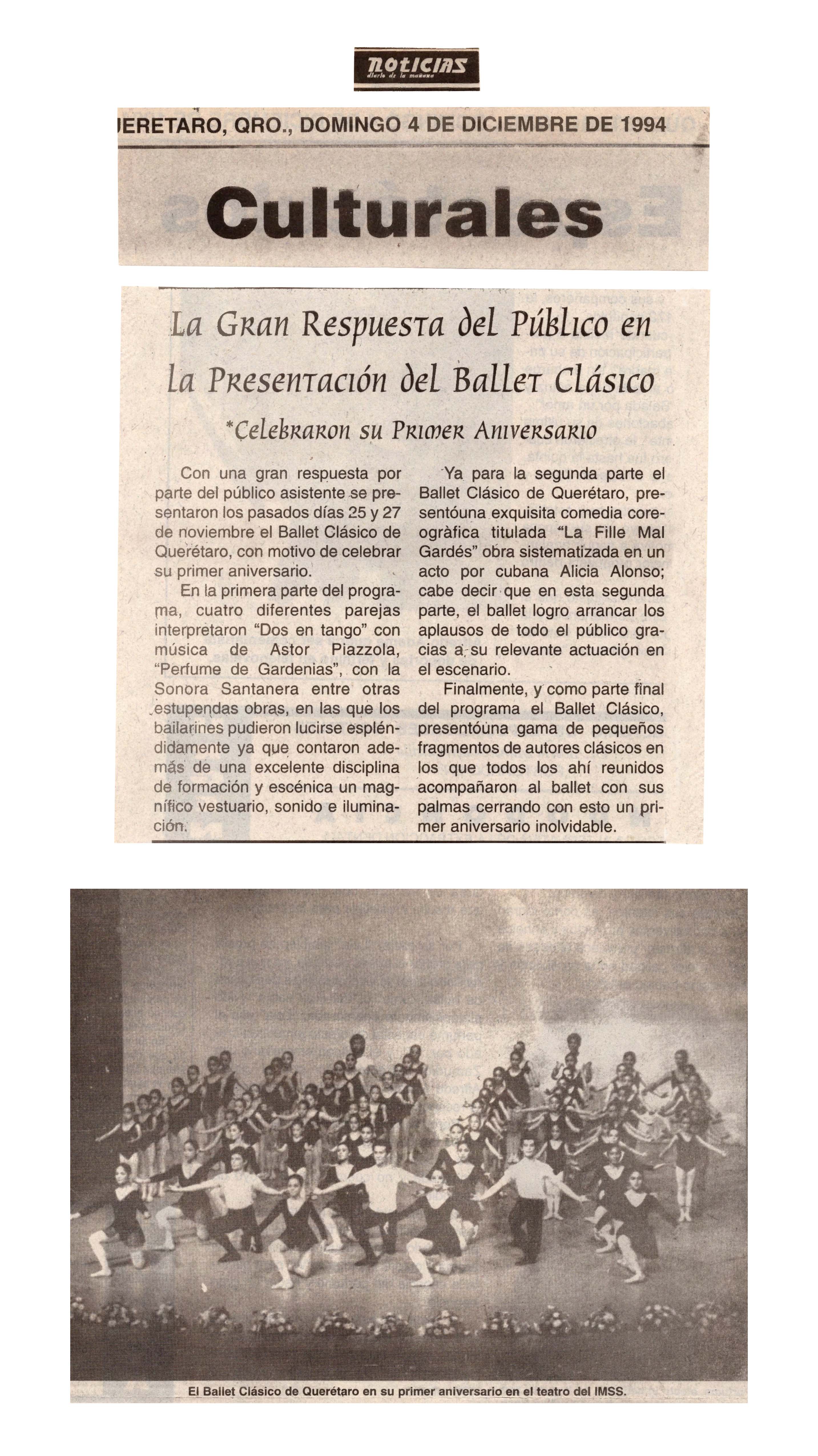Noticias, diario de la mañana. Querétaro, Qro. 4 de Diciembre de 1994."La gran respuesta del público en la presentación del Ballet Clásico".