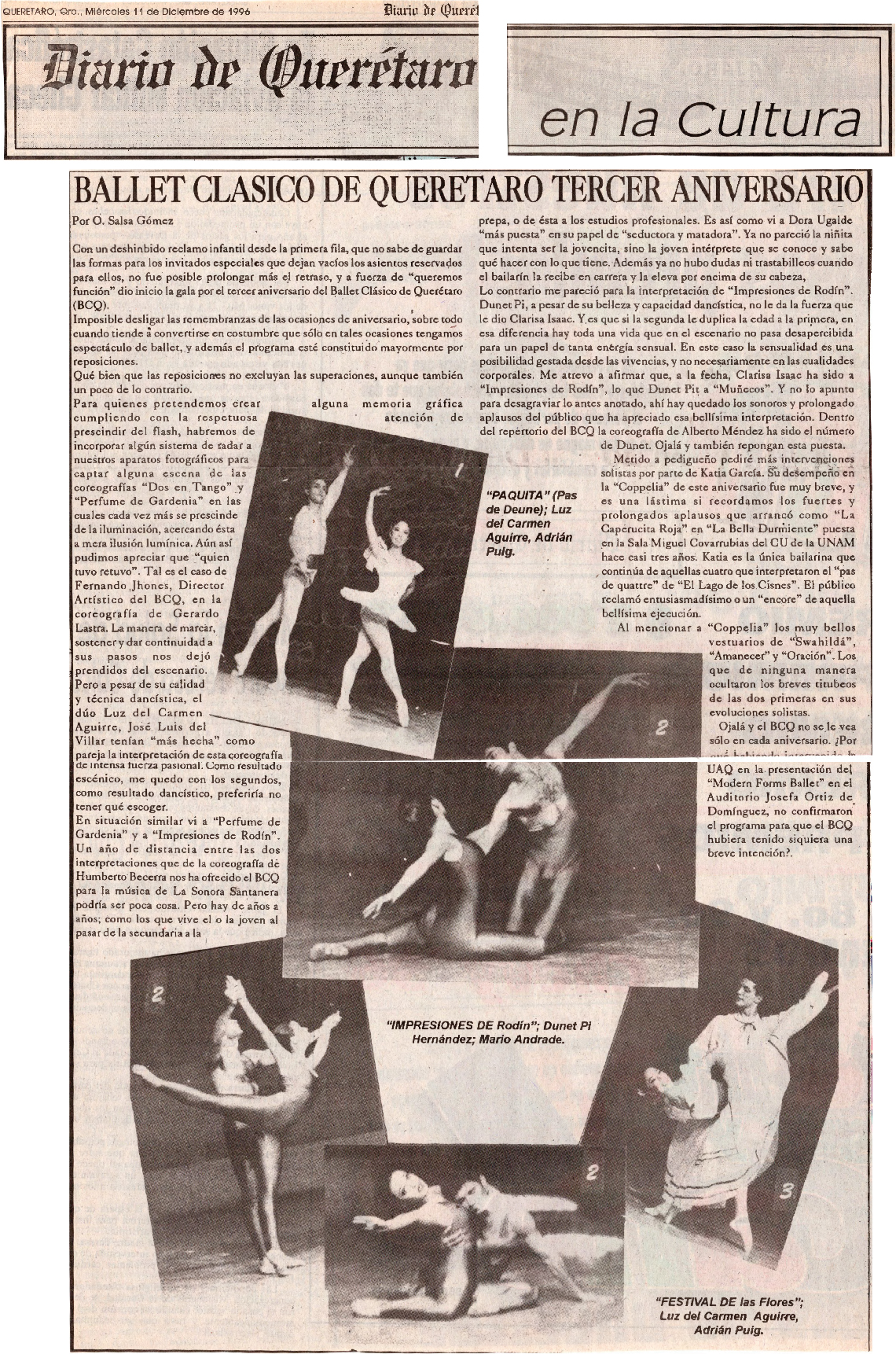 Diario de Querétaro. Querétaro, Qro. Miércoles 11 de Diciembre 1996. O. Salsa Gómez. Ballet Clásico de Querétaro tercer aniversario