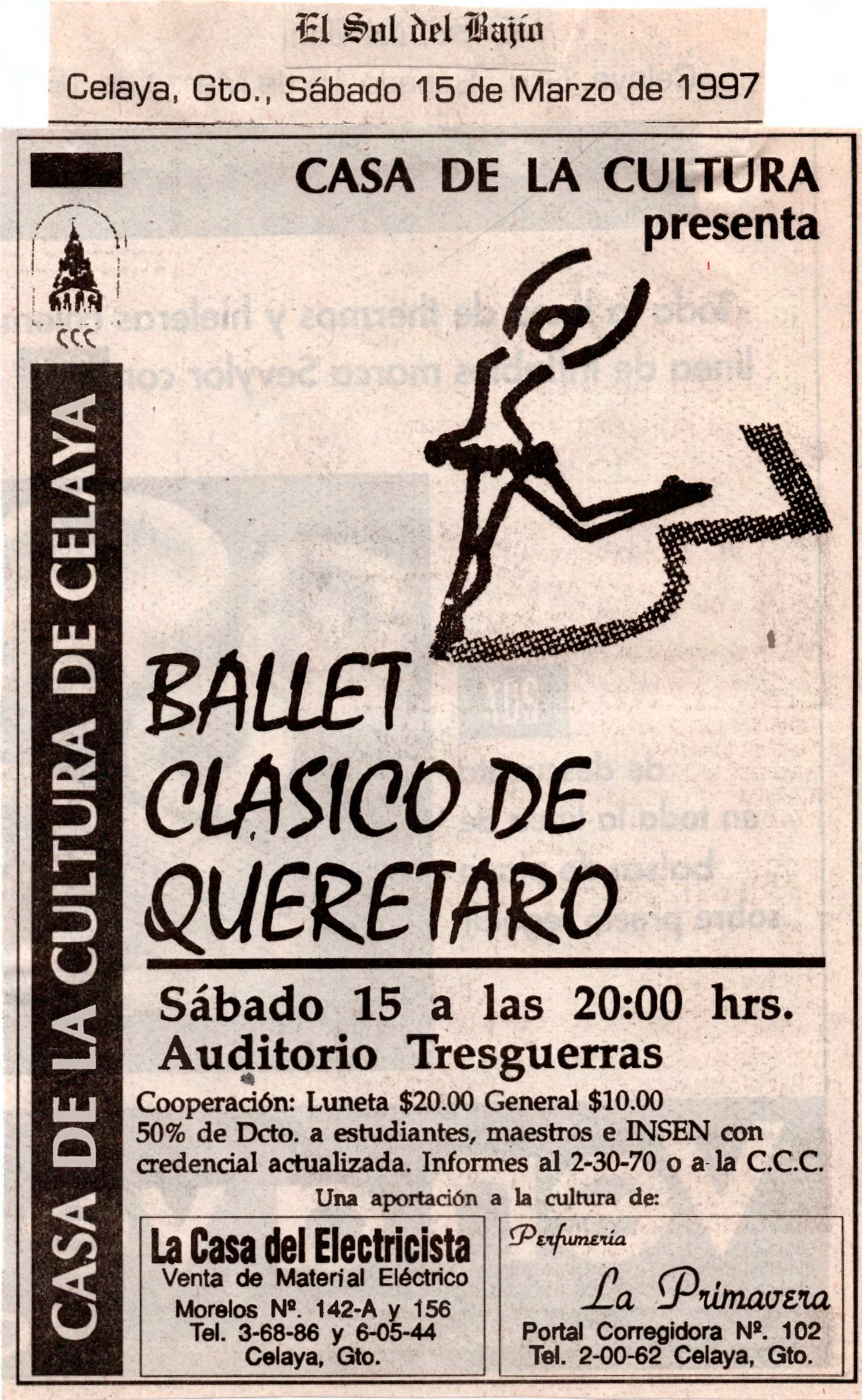 Anuncio de la presentación del Ballet Clásico en el Auditorio Tresguerras