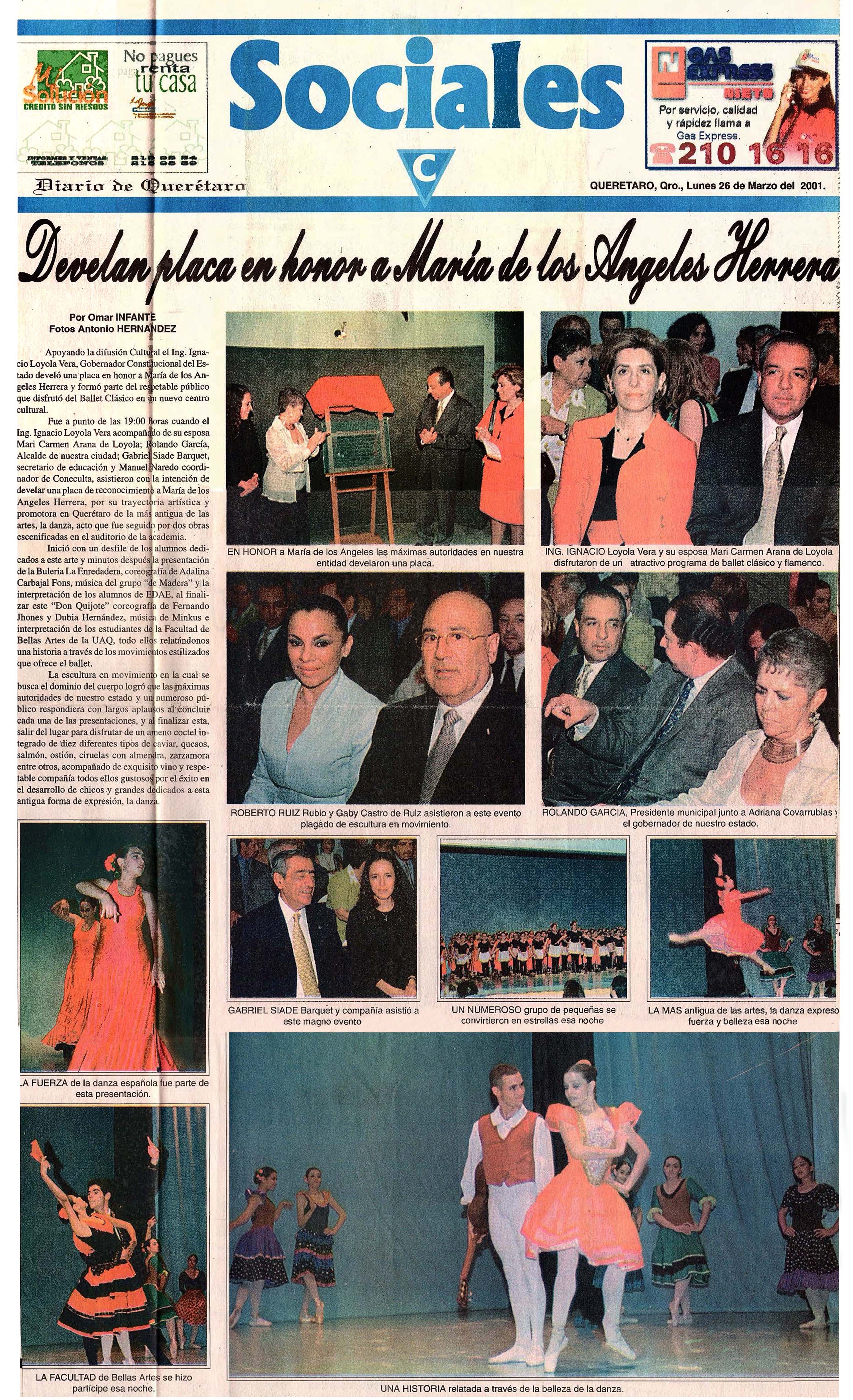 Nota en el periódico el Diario de Querétaro, acerca del evento en que se develó una placa en honor a María de los Angeles Herrera y en el que se presentó el Ballet Clásico de Querétaro.