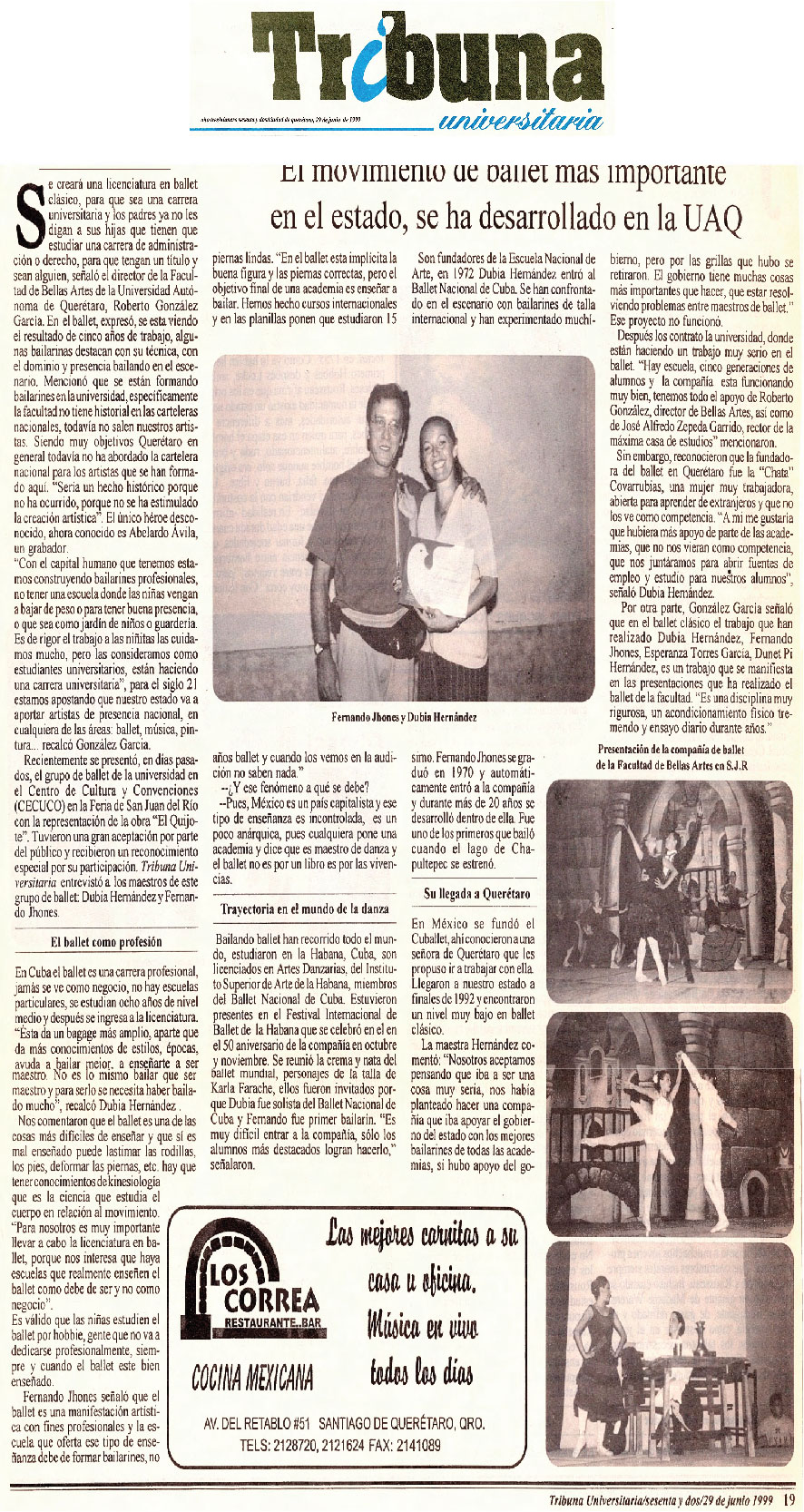 Nota sobre la creación de la carrera de ballet dentro de la FBA de la UAQ, por la importancia de los bailarines a nivel nacional, pertenecientes a la comunidad