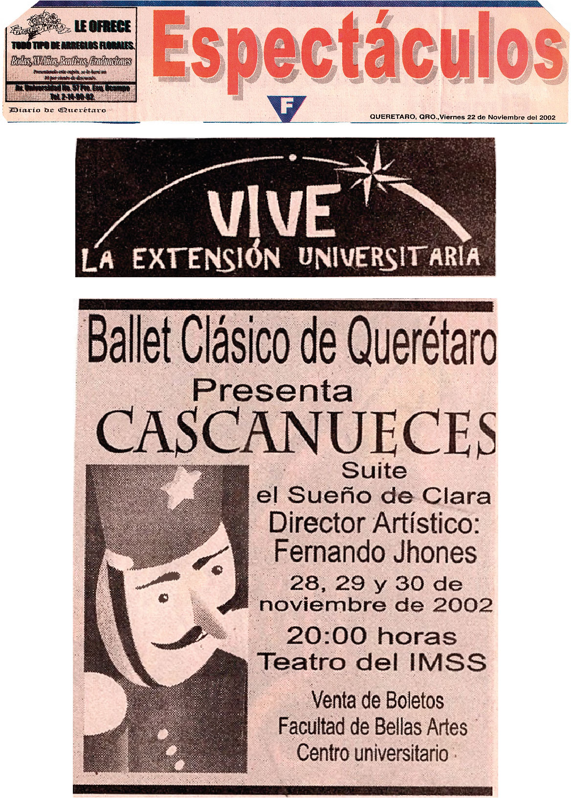 Anuncio sobre la presentación del Cascanueces Suite el Sueño de Clara. Director Artístico: Fernando Jhones. 28, 29 y 30 de noviembre de 2002. 20 hrs.