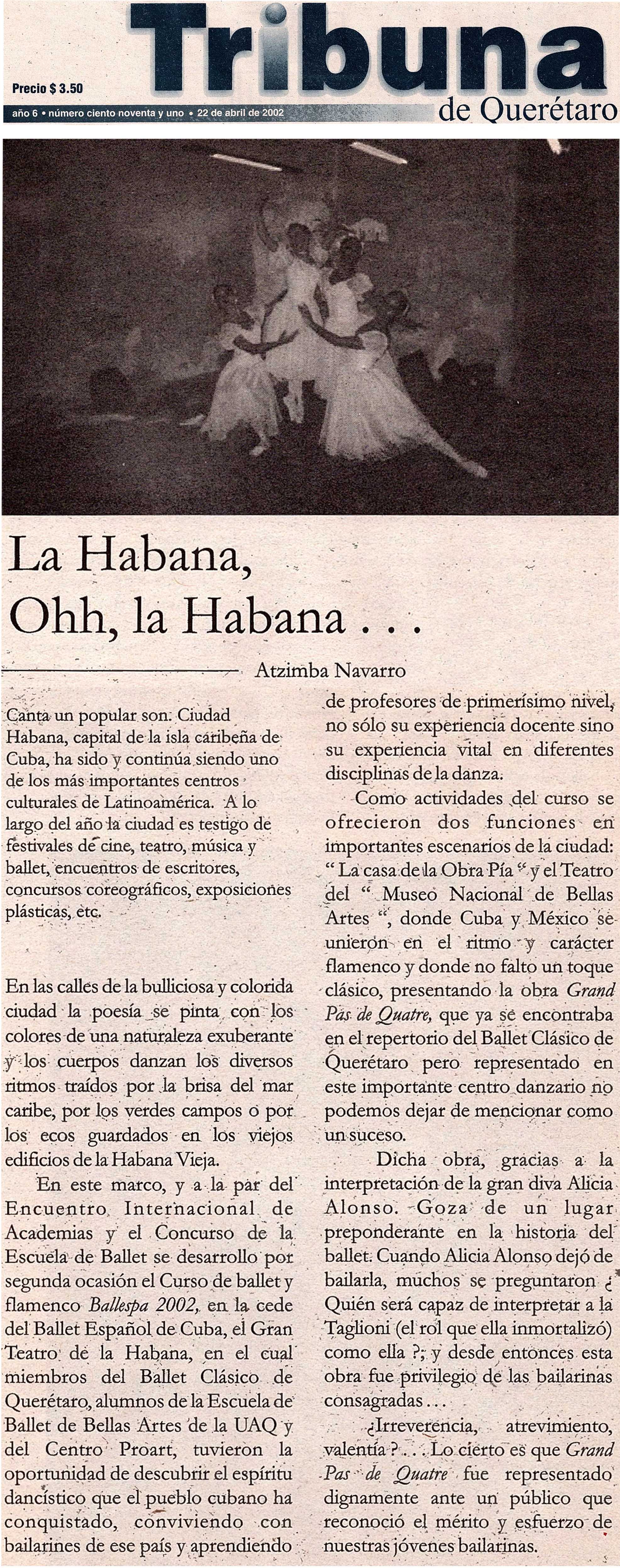 Nota en el periódico el Tribuna de Querétaro, sobre el segundo curso Ballespa 2002, llevado a cabo en La Habana, y al cual asistieron los miembros del Ballet Clásico de Querétaro, alumnos de la Escuela de Bellas Artes de la UAQ y el Centro Proart.