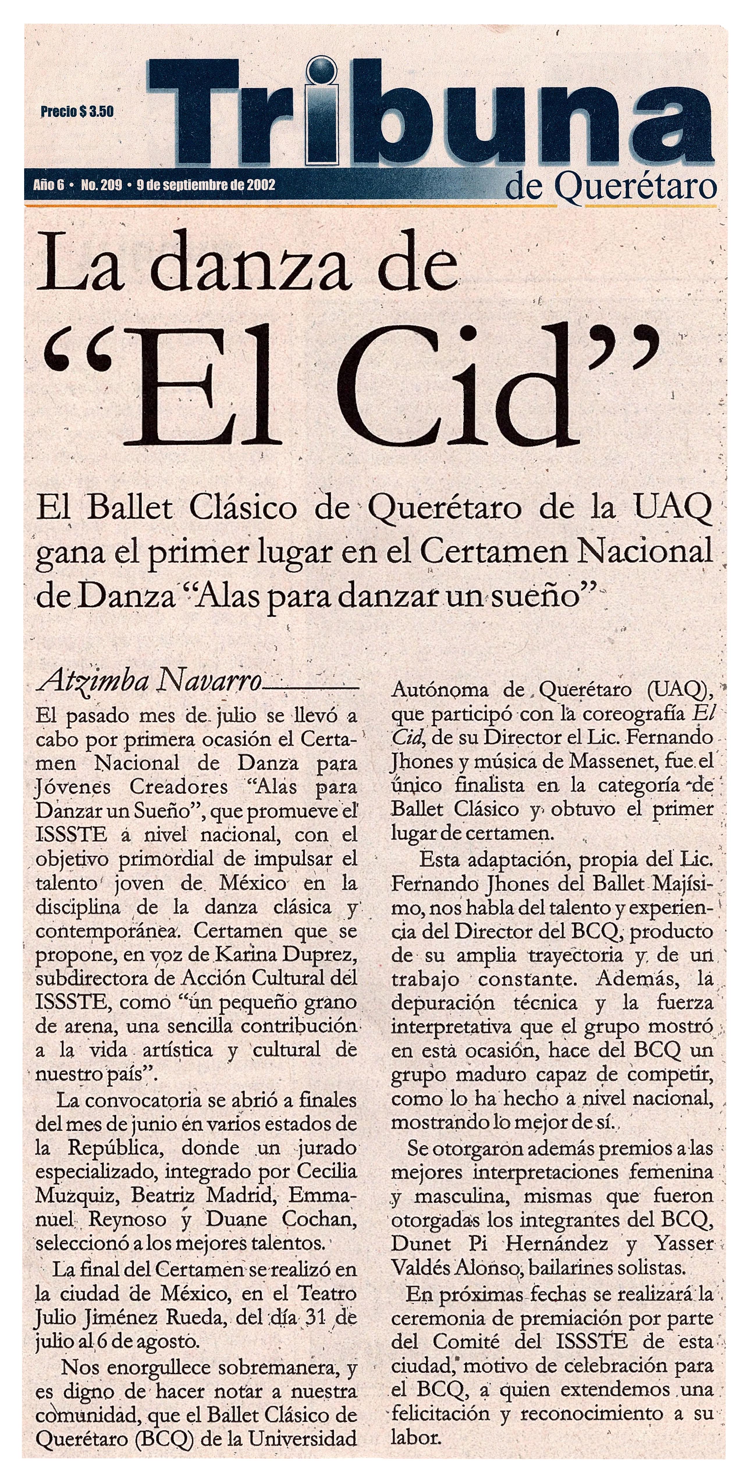 Nota en el periódico el Tribuna de Querétaro, sobre la obtención del primer lugar por parte del Ballet Clásico de Querétaro, en el Certamen Nacional de Danza "Alas para danzar un sueño" (promovido por el ISSSTE), con la coreografía de "El Cid".