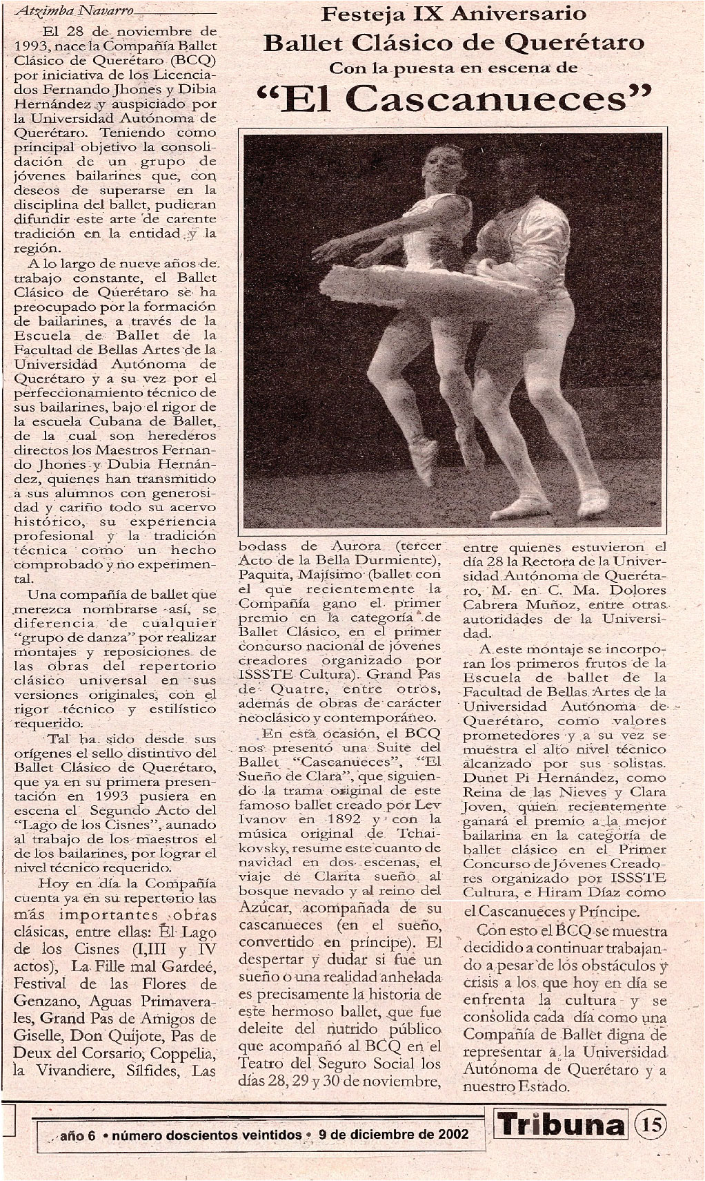 Tribuna. Año 6. Número 222. 9 de diciembre de 2002. Festeja IX Aniversario Ballet Clásico de Querétaro con la puesta en escena de "El Cascanueces". Atzimba Navarro