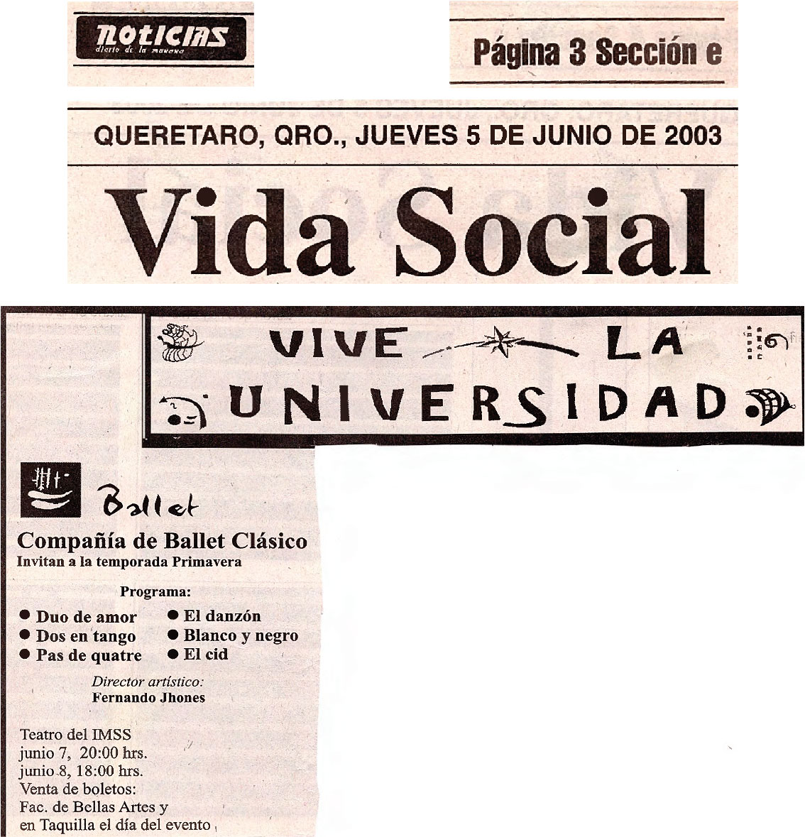 Noticias. Página 3. Sección e. Querétaro, Qro., Jueves 5 de junio de 2003. Vida social. Vive la Universidad. Compañía de Ballet Clásico invitan a la temporada de Primavera
