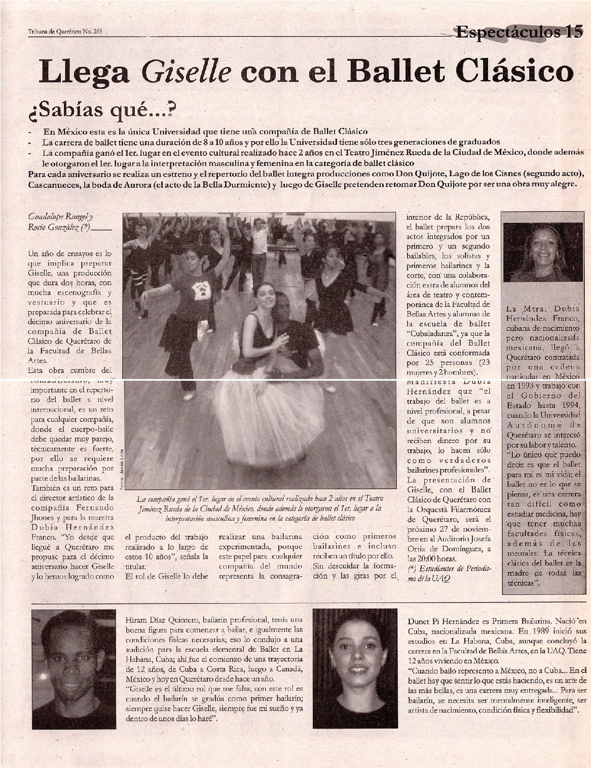 Tribuna de Querétaro. No. 263. Espectáculos 15. Llega Giselle con el Ballet Clásico. Guadalupe Rangel y Rocío González