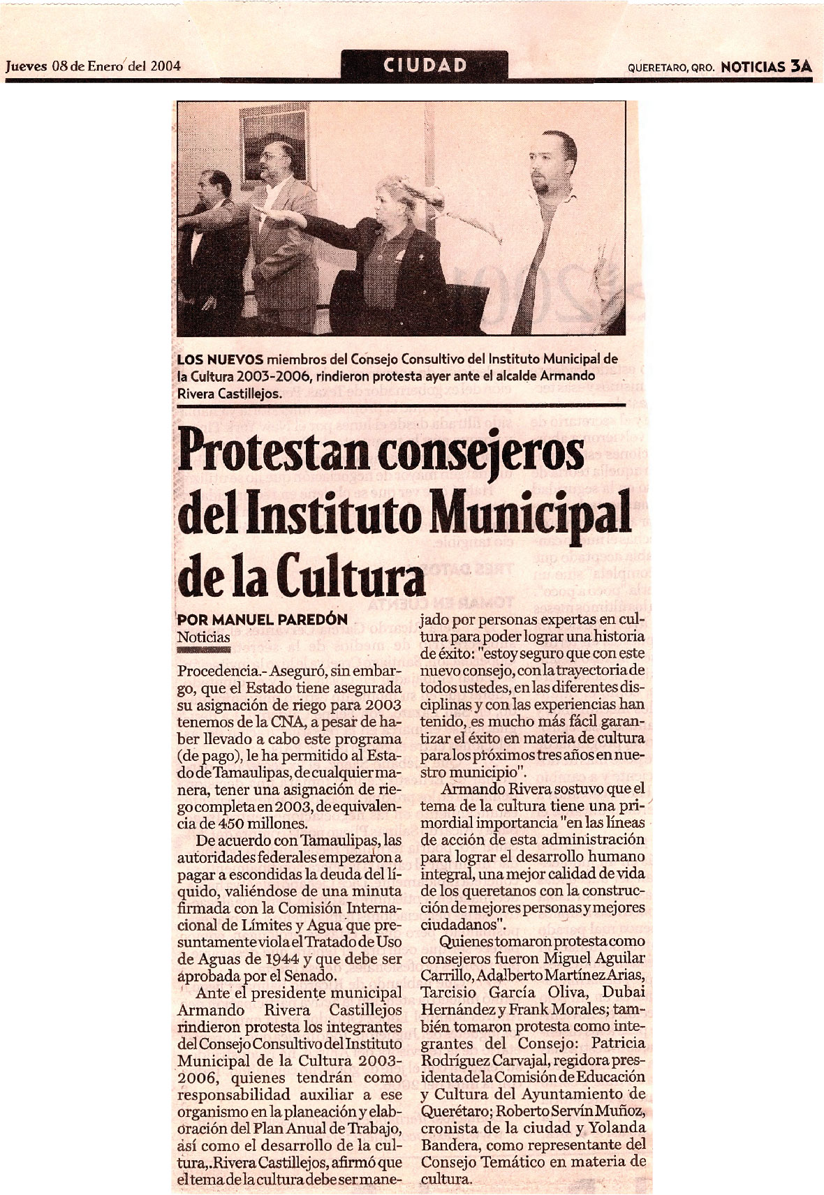 Noticias. 3A. Ciudad. Jueves 08 de Enero de 2004. Protestan consejeros del Instituto Municipal de la Cultura. Manuel Paredón