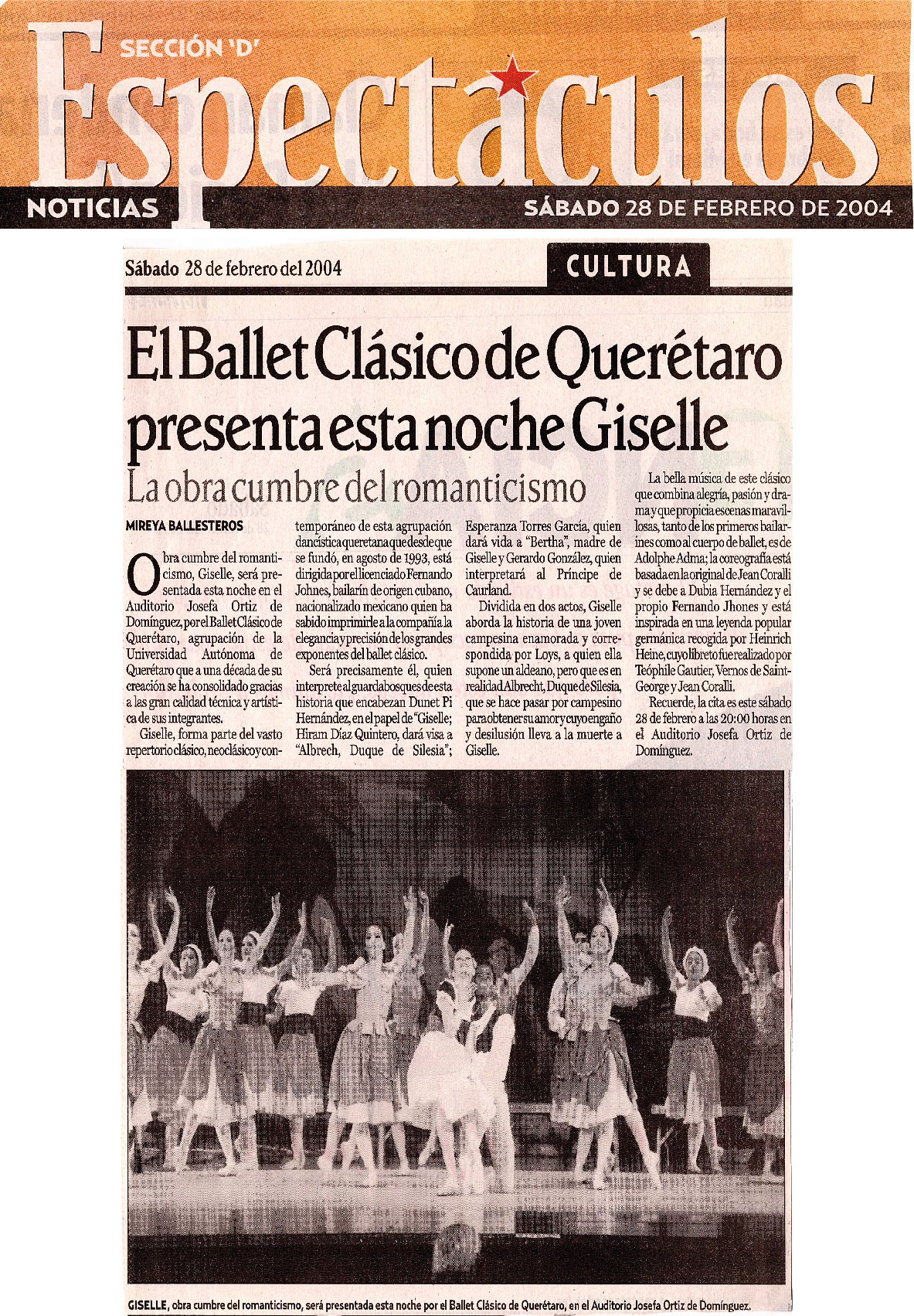 Espectáculos. Sección D. Noticias. Sábado 28 de Febrero de 2004. Cultura. El Ballet Clásico de Querétaro presenta esta noche Giselle. Mireya Ballesteros