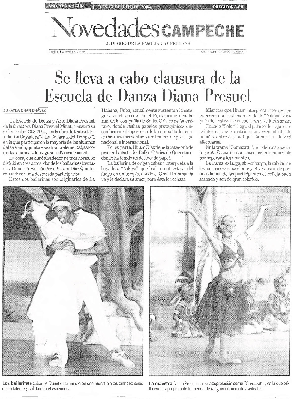 Novedades Campeche. Año 31. No. 11298. Jueves 15 e Julio de2004. El diario de la familia campechana. Se lleva a cabo clausura de la Escuela de Danza Diana Presuel. Zorayda Chan Chávez