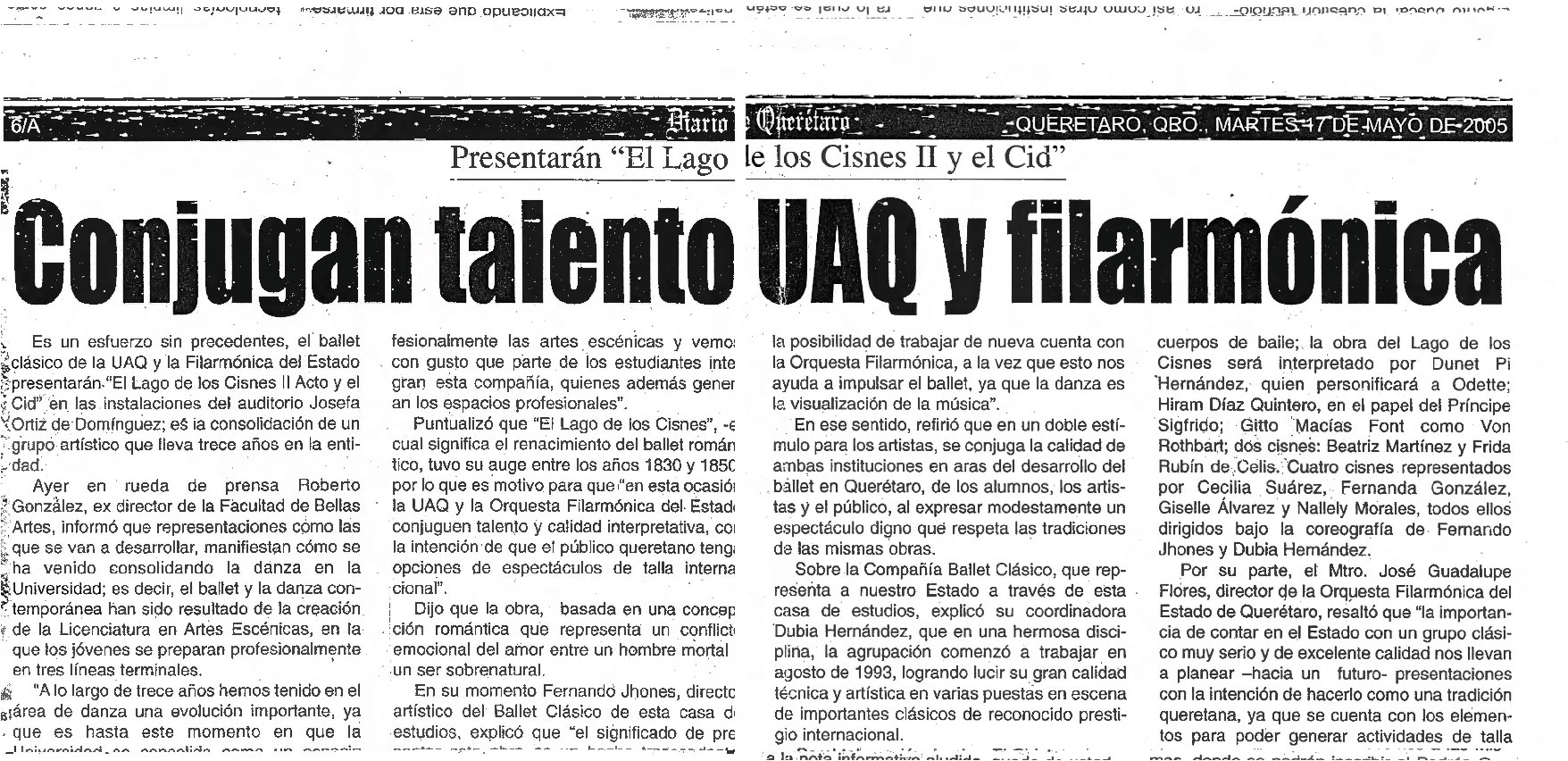 Diario de Querétaro. Querétaro, Qro., Martes 17 de mayo de 2005. Presentarán El Lago de los Cisnes II y el Cid. Conjugan talento UAQ y Filarmónica