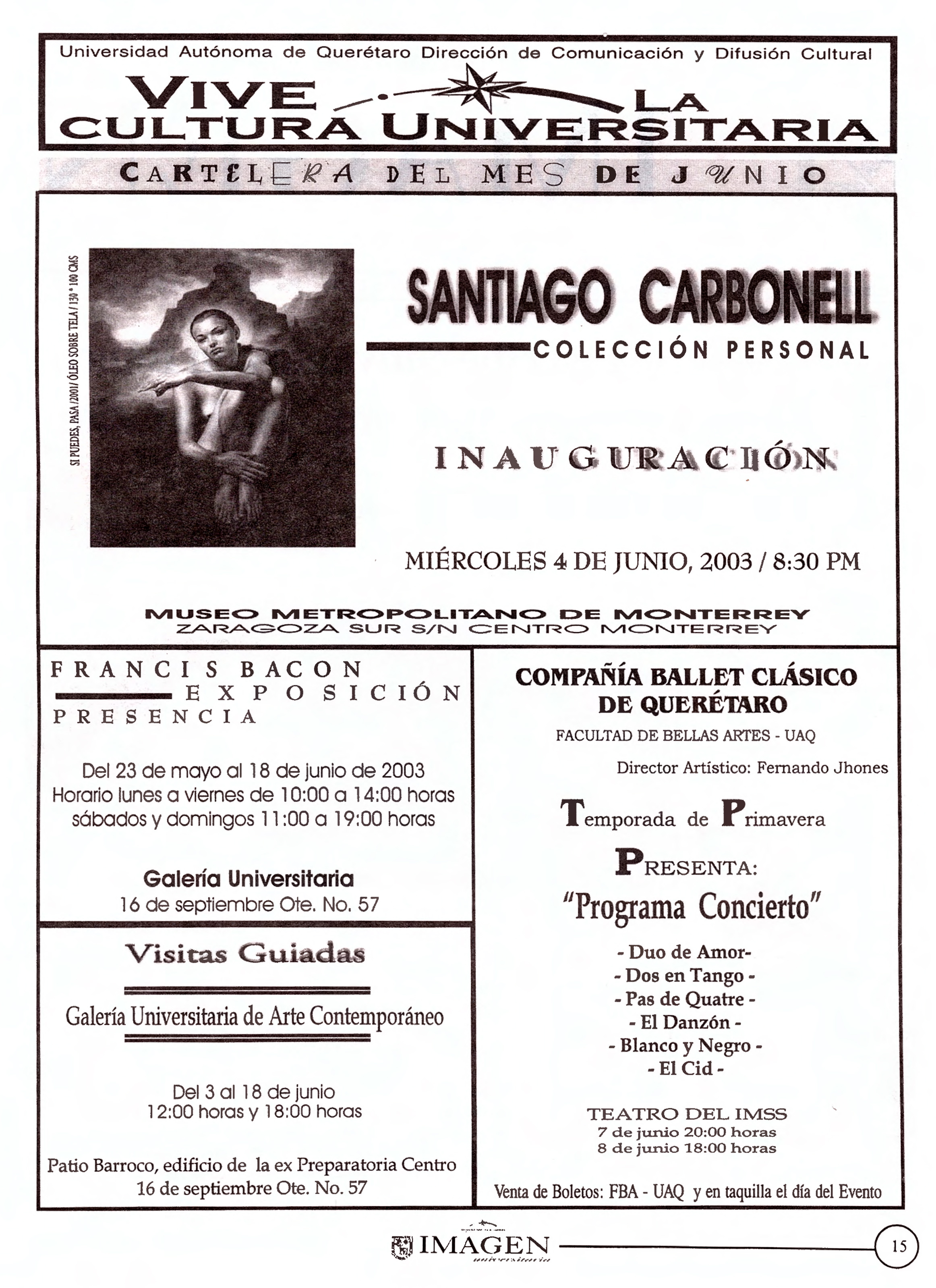 Imagen Universitaria. Semanario. Año 3. No. 123. 3 de junio de 2003. Vive la Cultura Universitaria. Cartelera del mes de junio. Temporada de Primavera Presenta: "Programa Concierto". Ballet Clásico de Querétaro