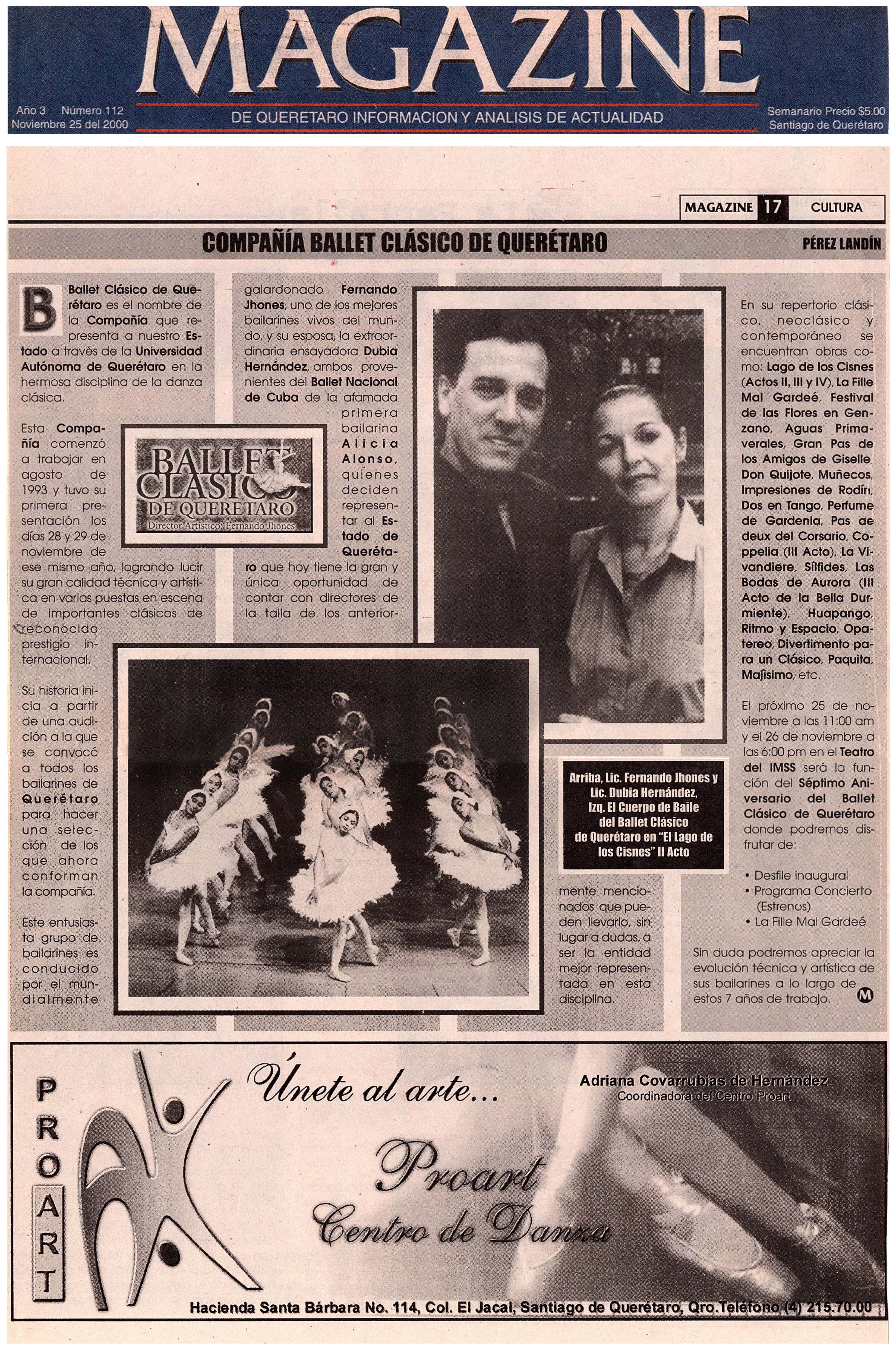 MAGAZINE. Querétaro, Qro. 25 de Noviembre de 2000. Peréz Landín."Compañía Ballet". Página 17, Cultura.