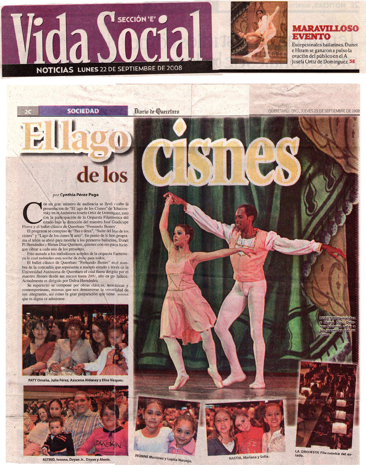 Diario de Querétaro. Sección E. Vida social. Noticias. Lunes 22 de septiembre de 2008. El Lago de los Cisnes. Cynthia Pérez Puga