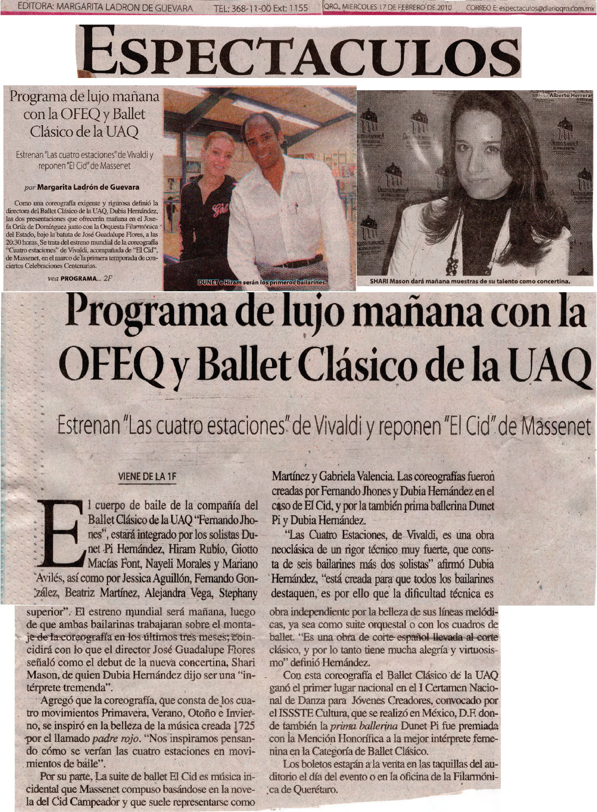 Espectáculos. Diario de Querétaro. Querétaro, Qro., Miércoles 17 de febrero de 2010. Programa de lujo mañana con la OFEQ y el Ballet Clásico de la UAQ. Margarita Ladrón Guevara