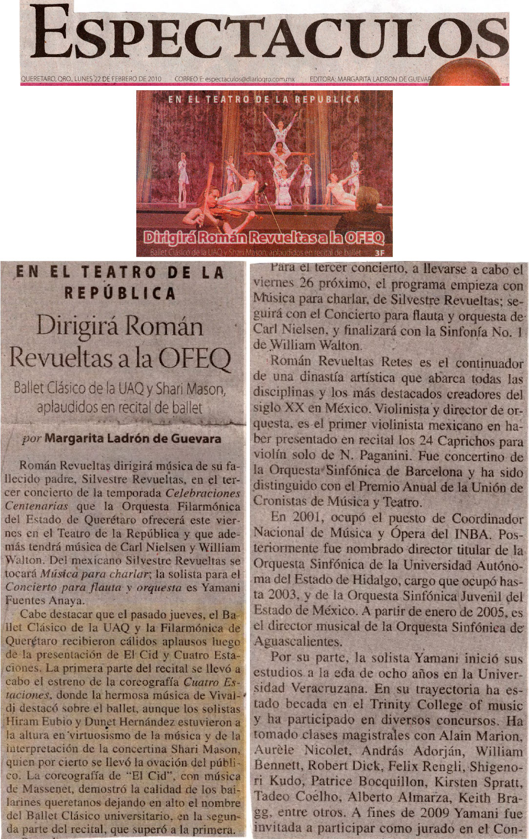 Espectáculos. Diario de Querétaro. Querétaro, Qro., Lunes 22 de febrero de 2010. En el Teatro de la República dirigirá Román Revueltas a la OFEQ. Margarita Ladrón Guevara