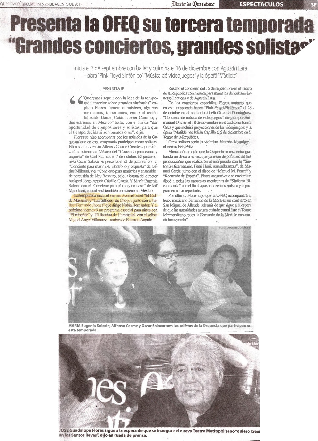 Diario de Querétaro. Espectáculos. Querétaro, Qro., viernes 26 de agosto de 2011. Presenta la OFEQ su tercera temporada "Grandes conciertos, grandes solistas"