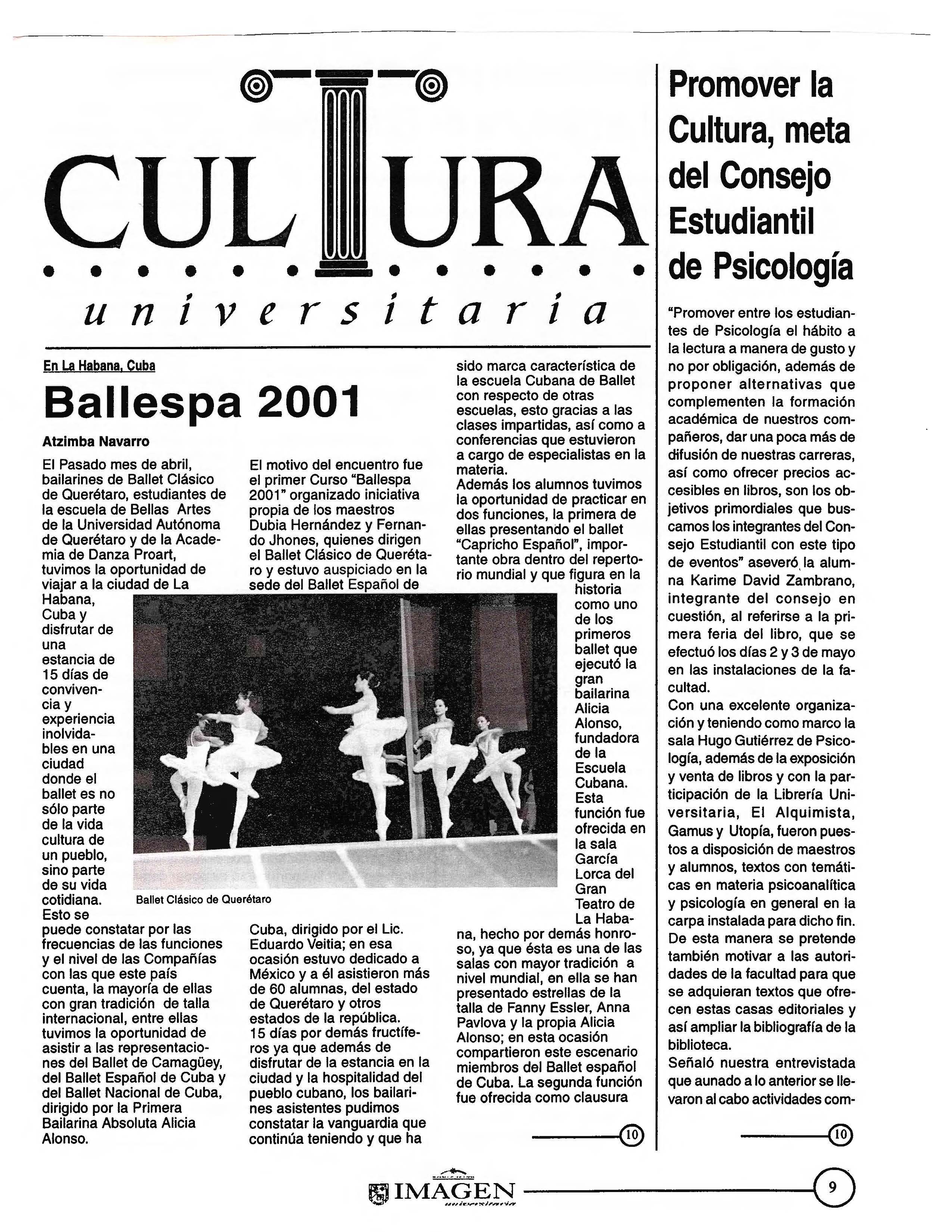 Nota por Atzimba Navarro (miembro del Ballet Clásico de Querétaro) en la revista IMAGEN universitaria, acerca del curso Balletspa 2001, llevado a cabo en La Habana Cuba.