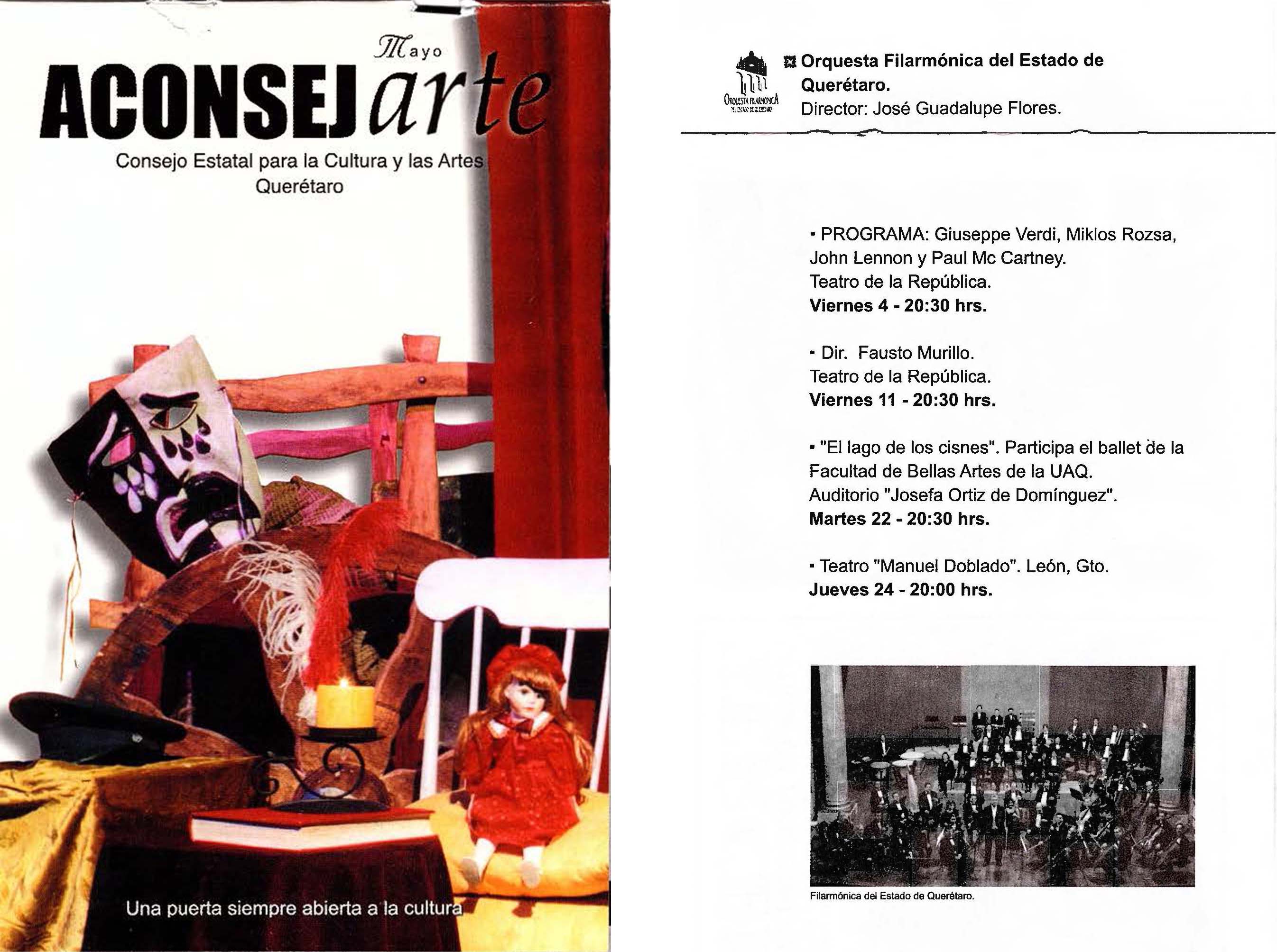 Programa de presentaciónes de la Orquesta Filarmónica de Querétaro en el mes de Mayo de 2001; con la participación del Ballet Clásico de Querétaro, el martes 22 de Mayo de 2001.