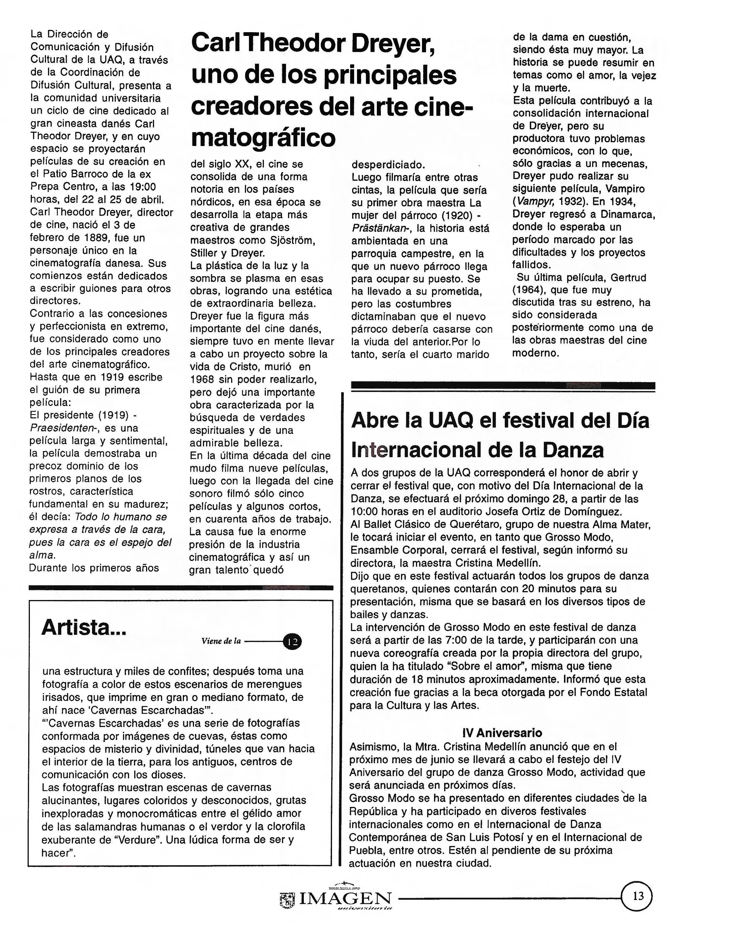 Nota en la revista IMAGEN universitaria, acerca del evento para el Día Internacional de la Danza que realizó la Universidad Autonóma de Querétaro, el cual abrió el Ballet Clásico de Querétaro.