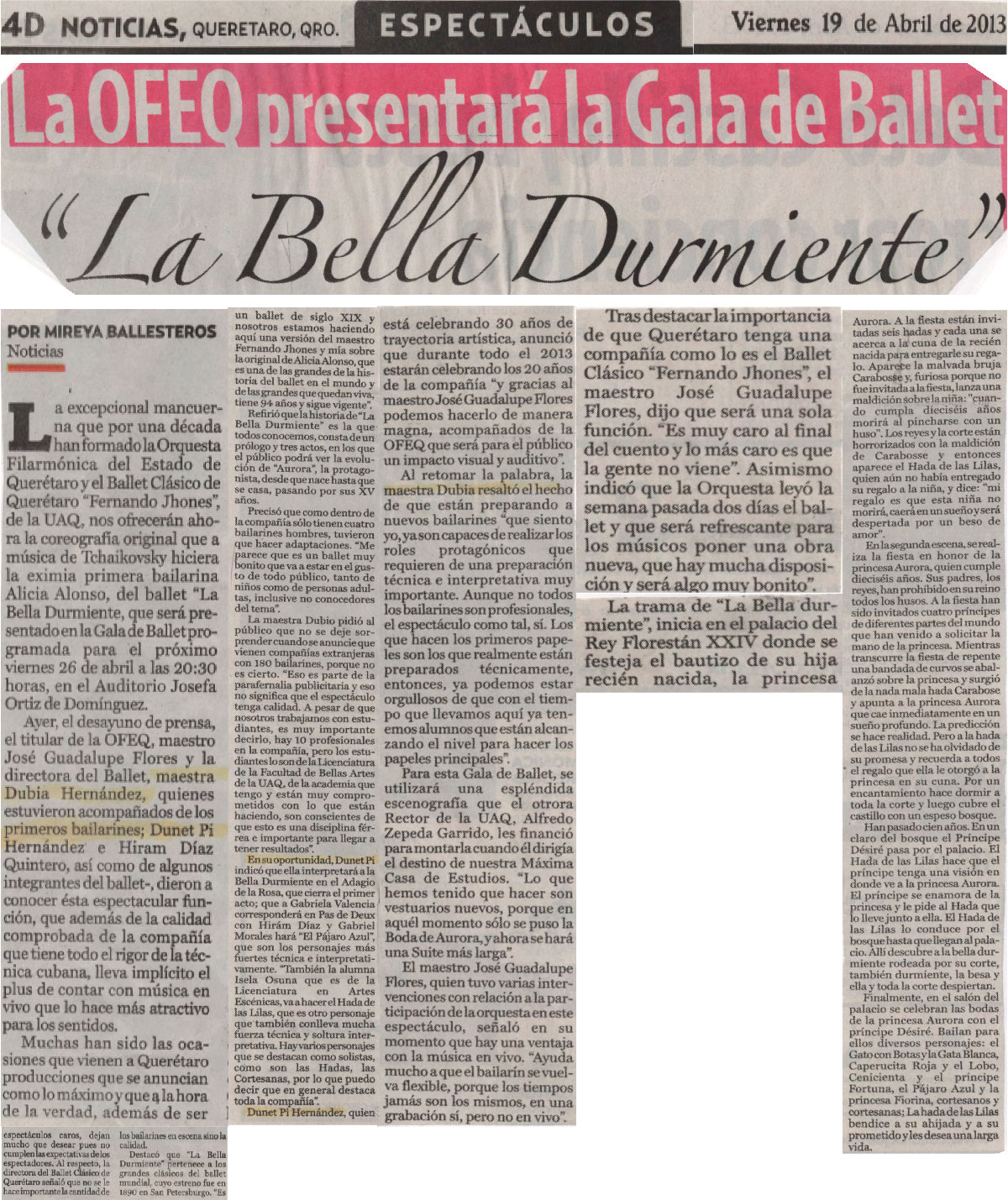 4D. Noticias. Querétaro, Qro. Espectáculos. Viernes 19 de abril de 2013. La OFEQ presentará la Gala de Ballet "La Bella Durmiente". Mireya Ballesteros