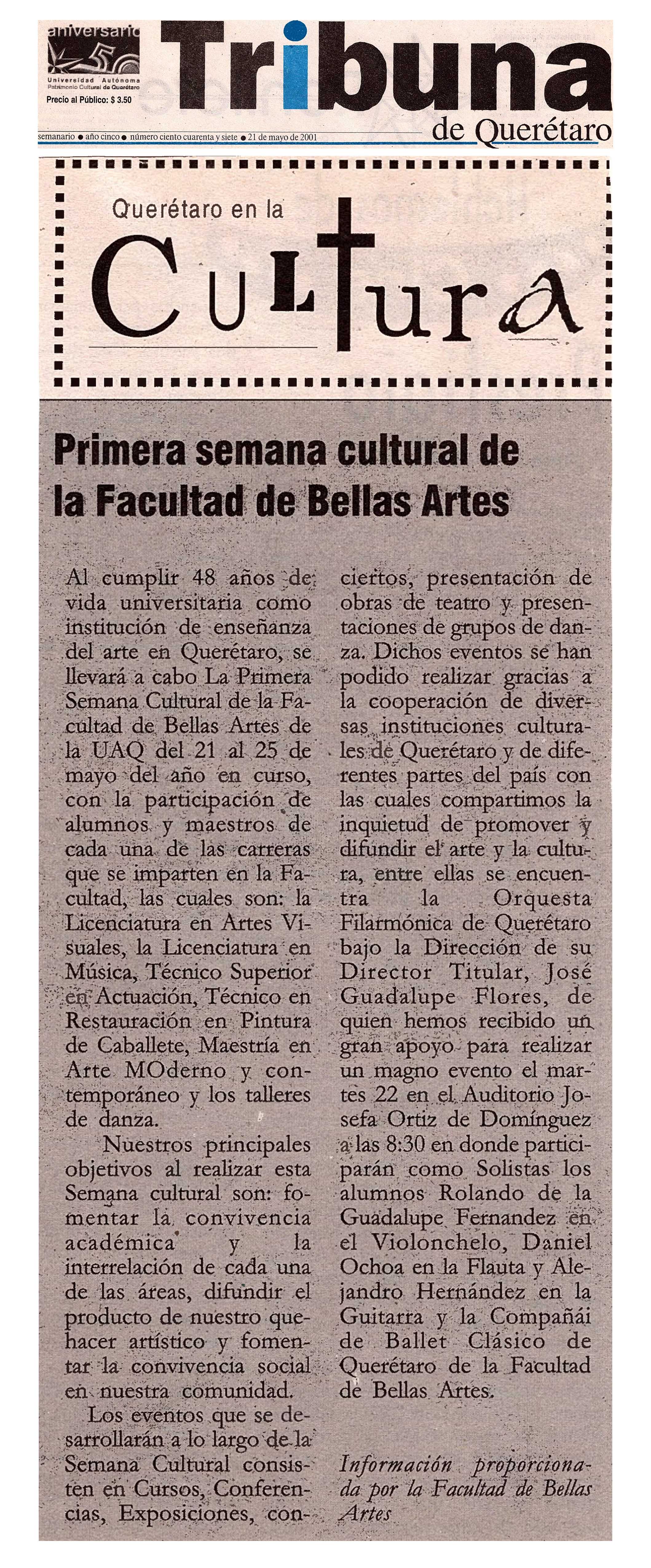 Tribuna de Querétaro. Querétaro, Qro. 21 de Mayo de 2001. Facultad de Bellas Artes, UAQ."Primera semana cultural de la Facultad de Bellas Artes".