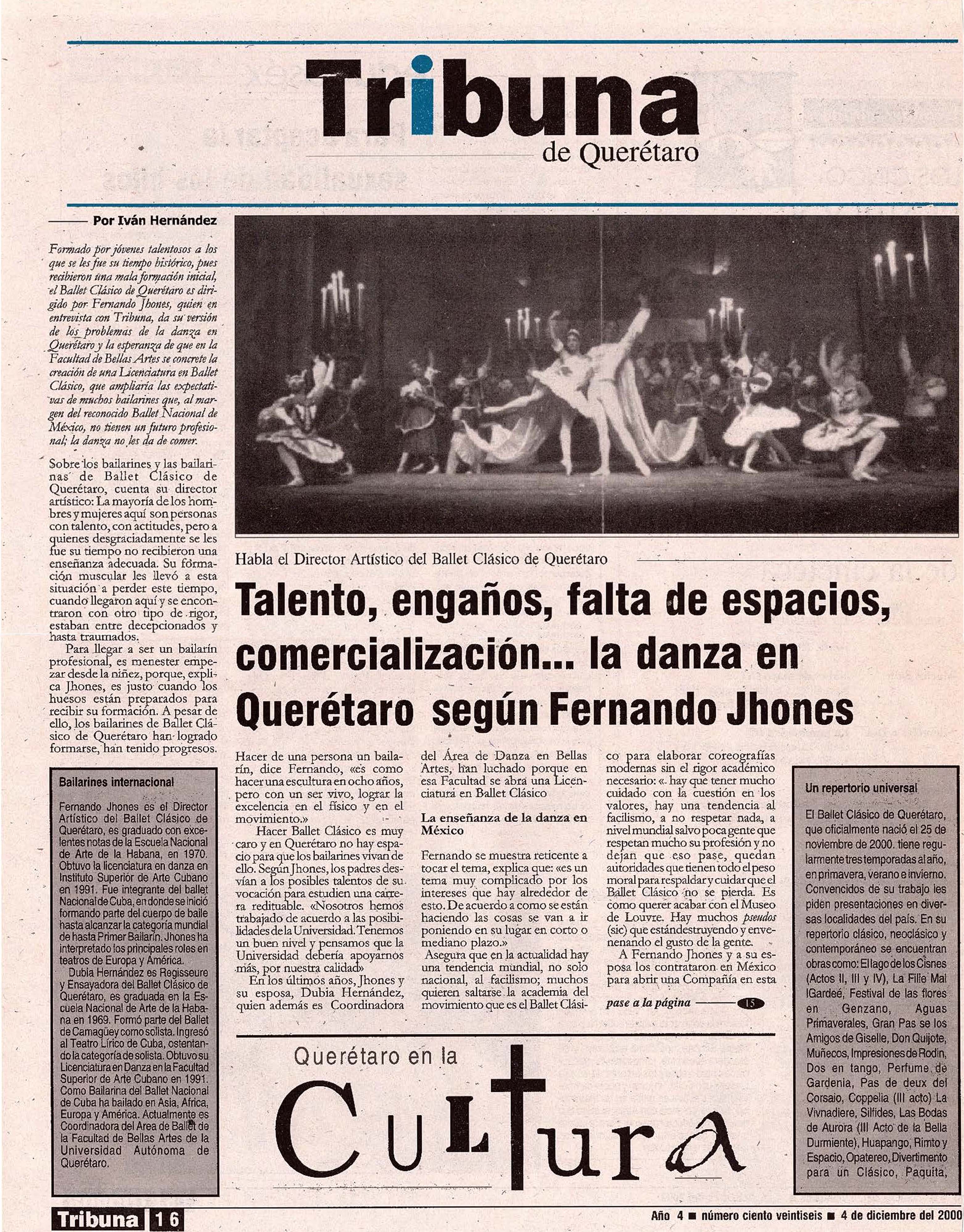 Tribuna de Querétaro. Querétaro, Qro. 4 de Diciembre de 2000. Iván Hernández."Talento, engaños, falta de espacios, comercialización... la danza en Querétaro según Fernado Jhones". Pág 16.