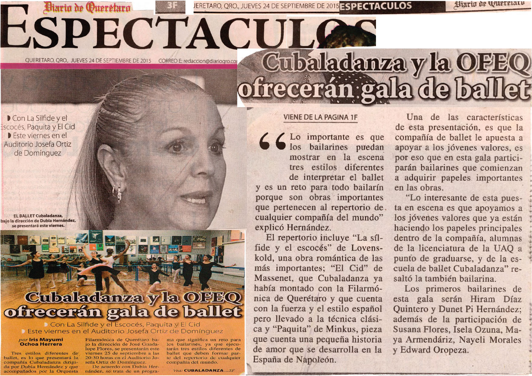 Diario de Querétaro. Espectáculos. 3F. Querétaro, Qro., jueves 24 de septiembre de 2015. Cubaladanza y la OFEQ ofrecerán gala de ballet. Iris Mayumi