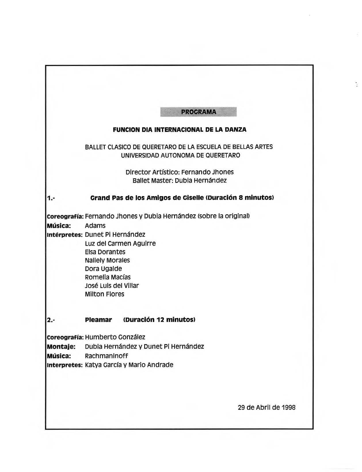 Programa para la función del Día de la danza en el año 1998.