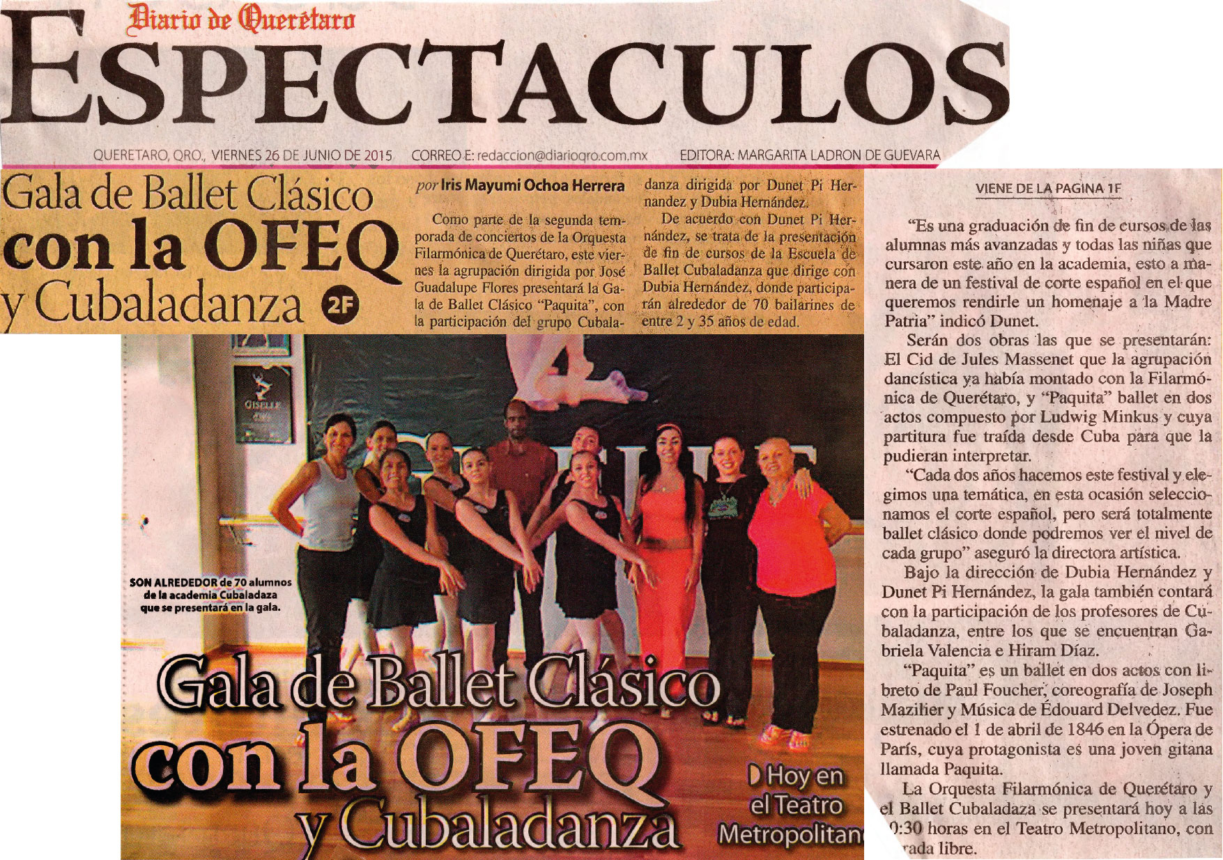 Diario de Querétaro. Espectáculos. Querétaro, Qro., viernes 26 de junio de 2015. Gala de Ballet Clásico con la OFEQ y Cubaladanza. Iris Mayumi