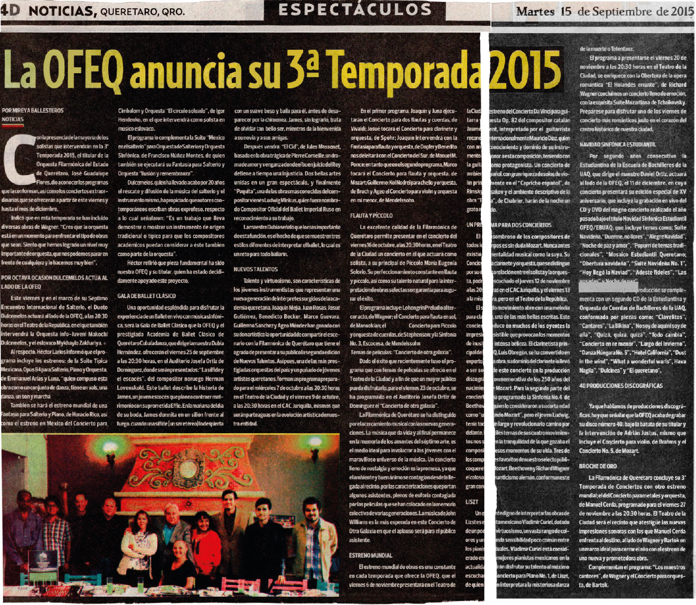 4D. Noticias. Querétaro, Qro. Espectáculos. Martes 15 de septiembre de 2015. La OFEQ anuncia su 3° Temporada 2015. Mireya Ballesteros