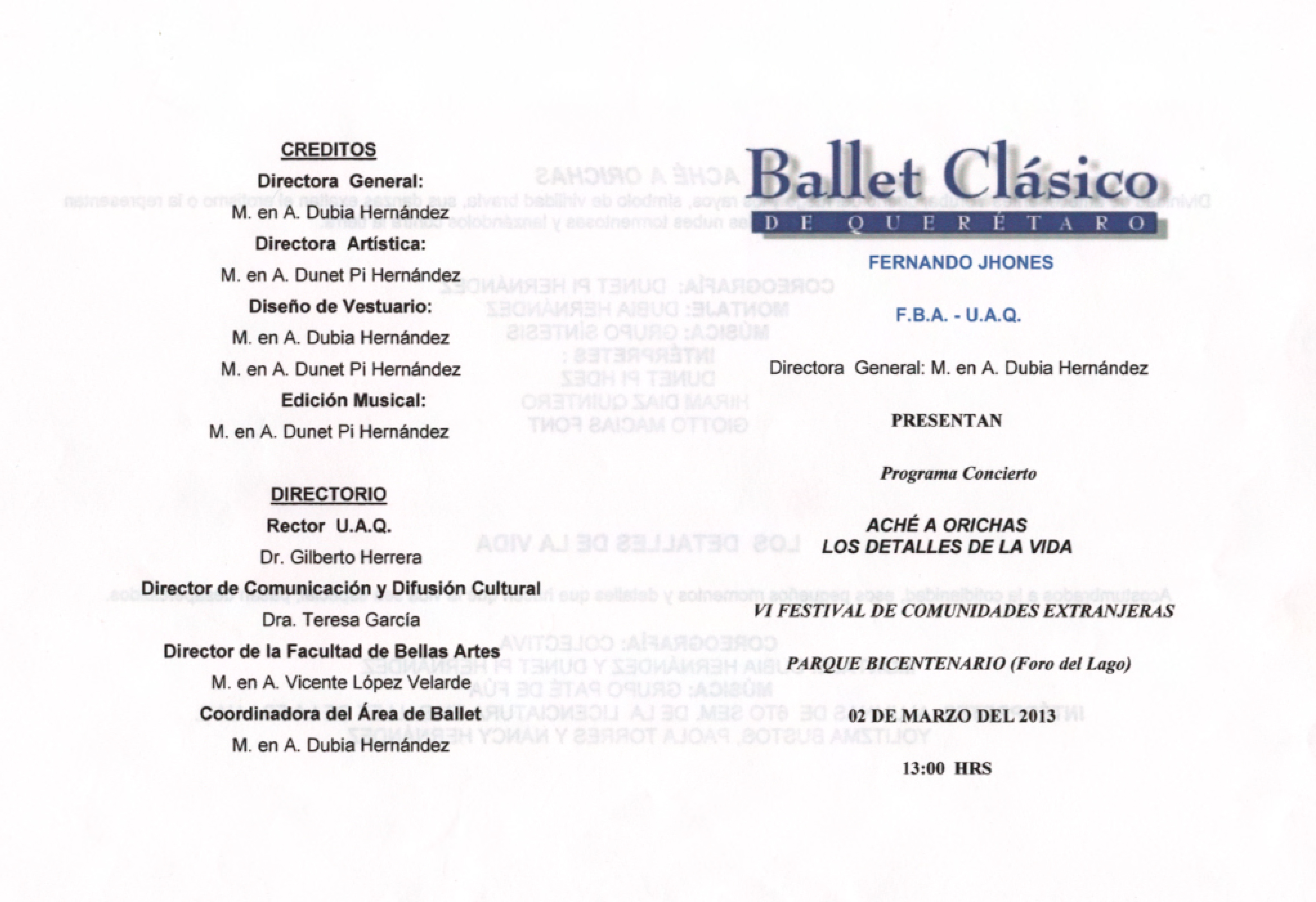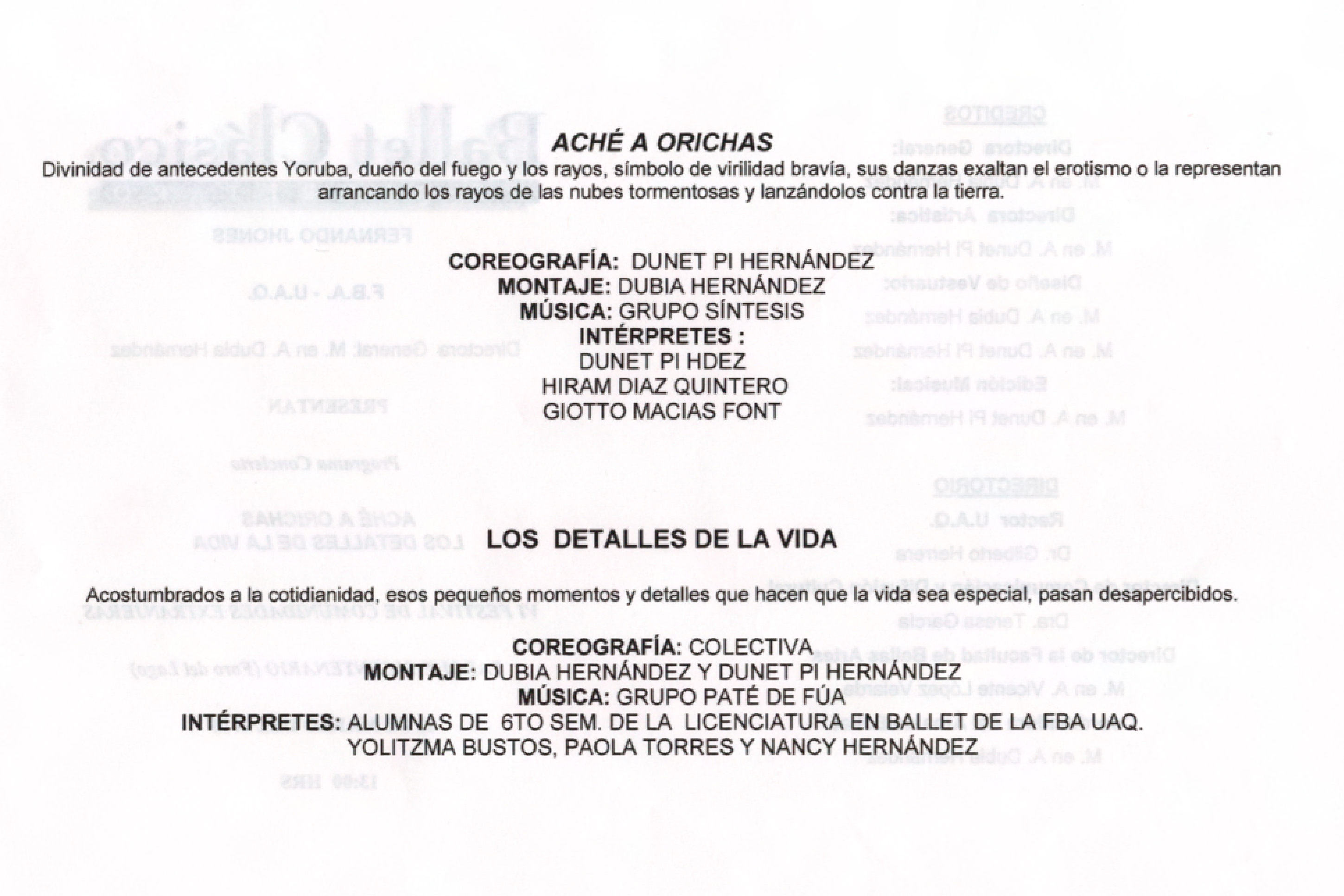 Ballet Clásico de Querétaro Fernando Jhones, “Aché a orichas. Los detalles de la vida,” ReDCA-Ballet, consulta 9 de marzo de 2026, http://redca.uaq.mx/ballet/items/show/382.