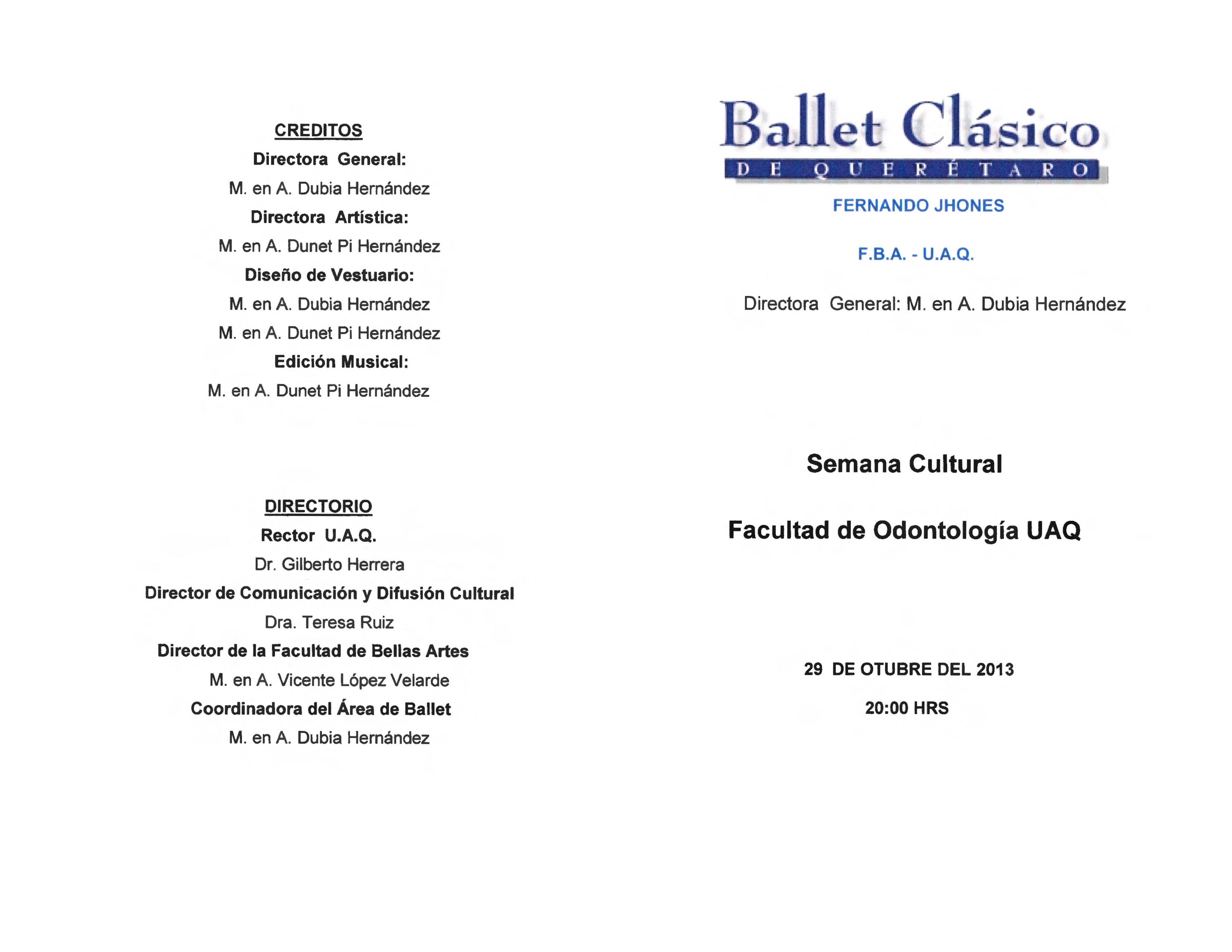 Ballet Clásico de Querétaro Fernando Jhones, “Semana Cultural. Facultad de Odontología UAQ,” ReDCA-Ballet, consulta 9 de marzo de 2026, http://redca.uaq.mx/ballet/items/show/389.