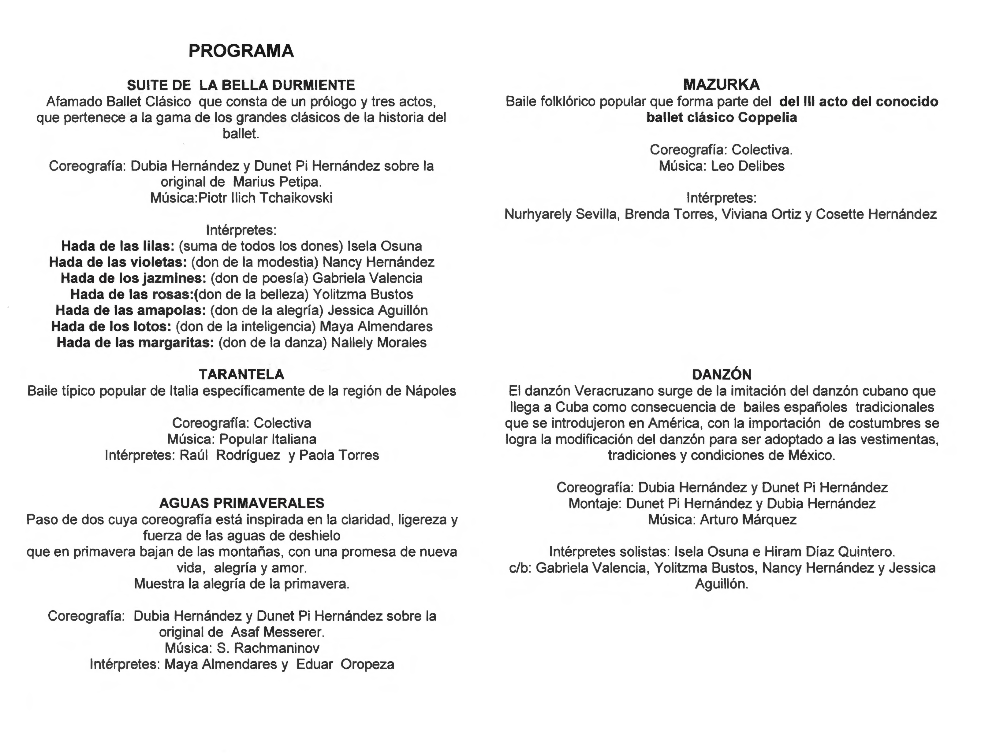 Programa compuesto por Suite de la Bella Durmiente, Tarantela, Aguas primaverales, Mazurka y Danzón